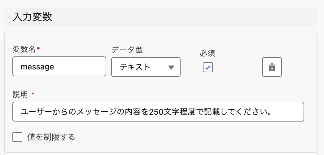 | 必須 | この入力変数が、フローを実行する上で必須かどうかを示します。 チェックボックスをオンにすると必須項目となり、AIエージェントはこの変数に必ず何らかの値を渡そうとします。オフの場合は任意項目です。 |