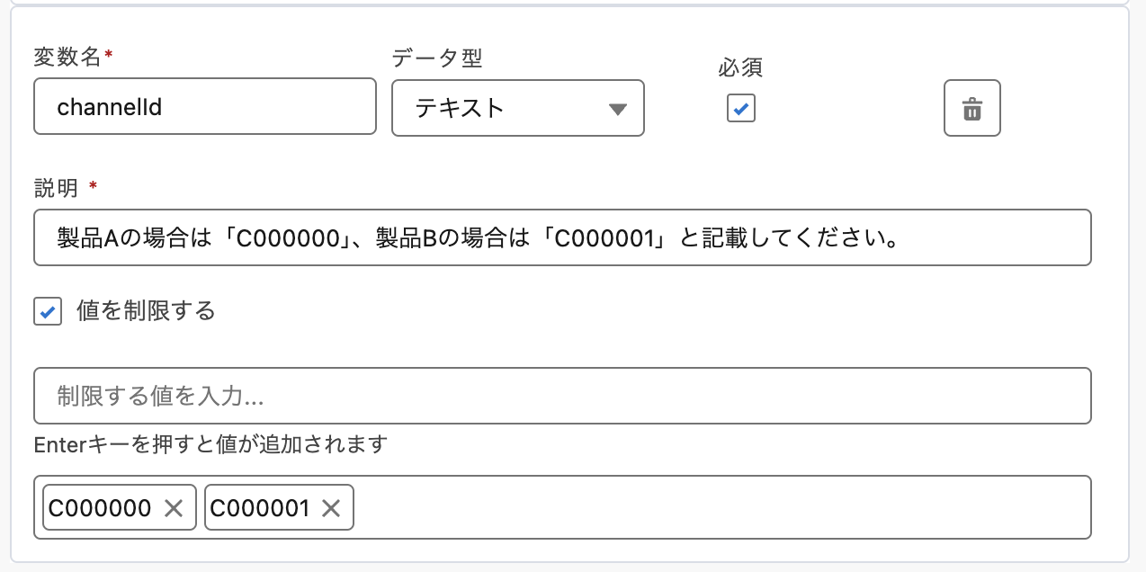 | 値を制限する | このチェックボックスをオンにすると、この入力変数に設定できる値の選択肢を限定します。 必要に応じてチェックボックスをオンにして、制限する値を設定してください。 |