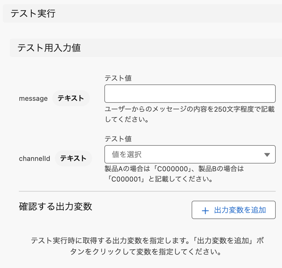 | 確認する出力変数 | フロー実行結果として返ってくる情報の中から確認したい出力変数を指定します。 「+ 出力変数を追加」ボタンで設定開始 フローが返す可能性のある出力変数名を入力すると、テスト結果画面で確認えきます。 |