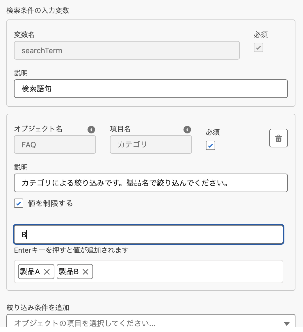 そのほかに、絞り込み条件として追加したい項目があれば追加します。たとえば、おなじFAQ記事のなかでも、製品Aと製品Bのカテゴリが存在し、AIエージェントが製品Aに関する記事のみを提示する場合は、カテゴリによる絞り込み条件を追加してください。