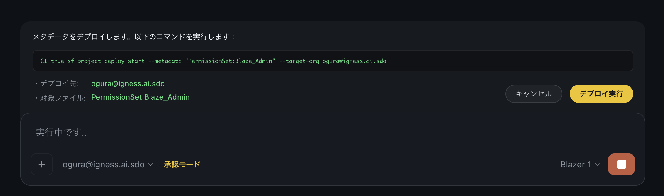 Salesforceへのデプロイ操作をより安全に行うための承認モードを新たに搭載しました。破壊的なデプロイコマンドを実行する前に、対象ファイルを確認し、承認または拒否を選択できます。
