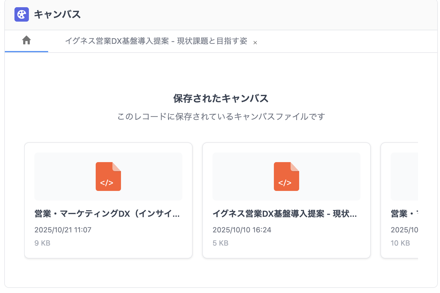 レコード上で保存したキャンバスファイルは、再度レコードページを開いたときにキャンバスコンポーネント上に一覧として表示されます。