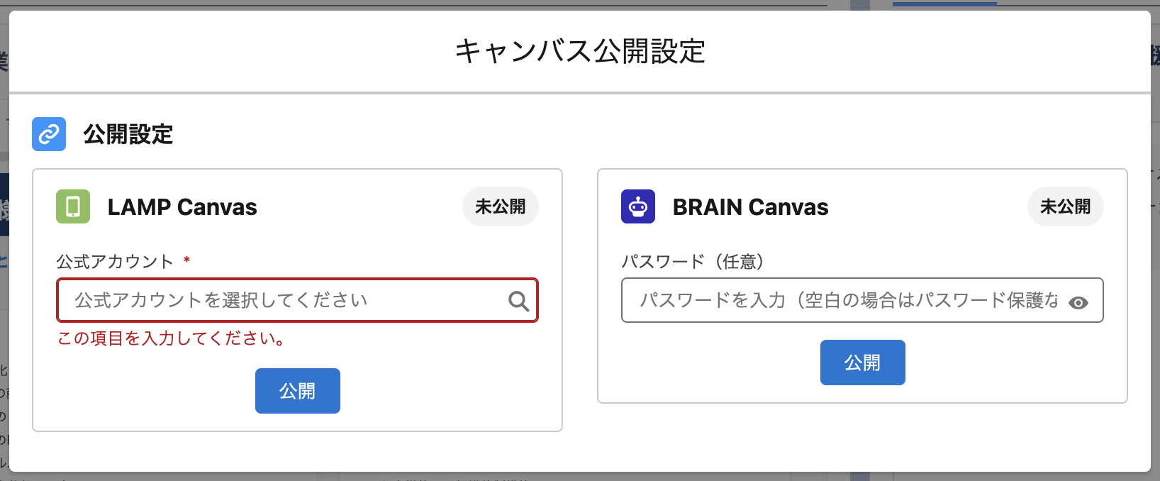 LAMPキャンバスもしくはBRAINキャンバスかを選び、「公開」ボタンをクリックします。