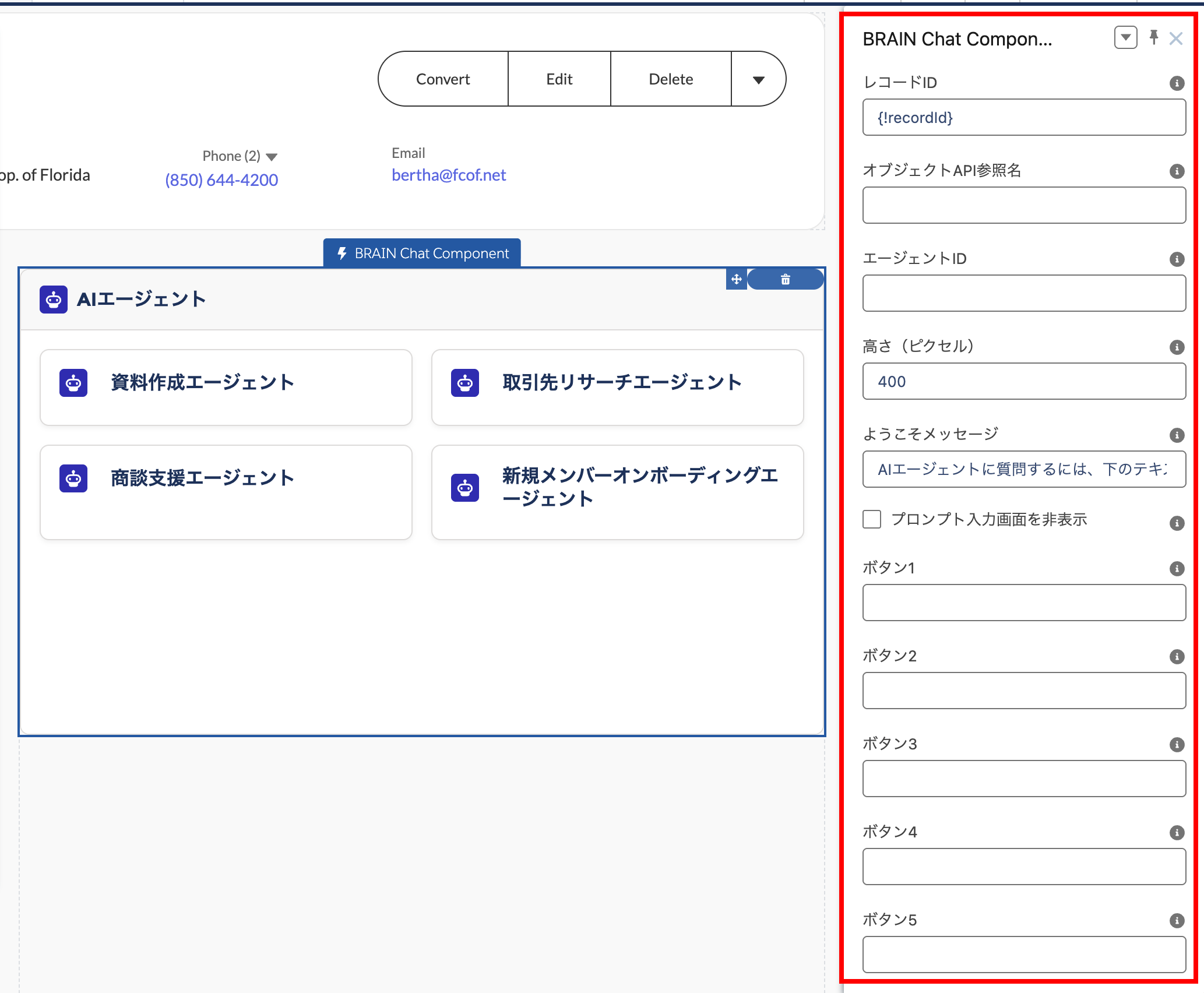 - 会話の履歴を表示したい場合は、ここに「エージェント会話履歴」のID項目が挿入されている項目のAPI参照名を入力すると過去の会話履歴を表示することができます。