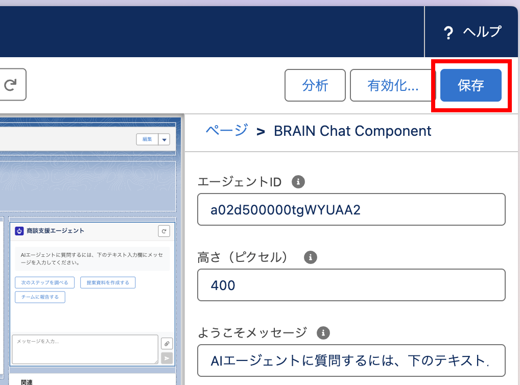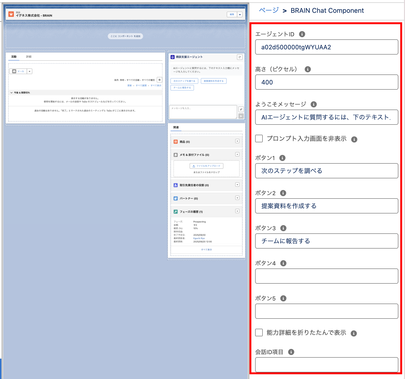 - 会話の履歴を表示したい場合は、ここに「エージェント会話履歴」のID項目が挿入されている項目のAPI参照名を入力すると過去の会話履歴を表示することができます。