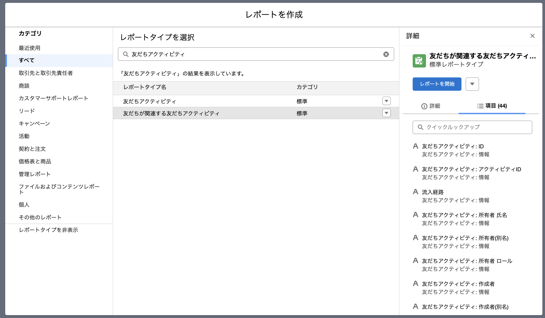レポートタイプの選択画面にて、「友達が関連する友達アクティビティ」レポートタイプを選択します。