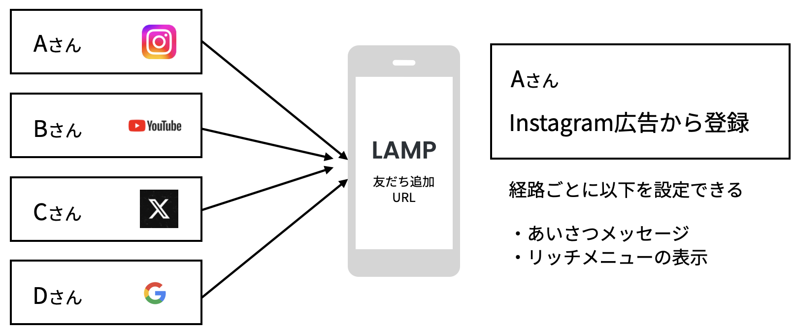 この機能は、広告の費用対効果の測定と予算配分の最適化に役立ちます。例えば、Google広告とInstagram広告を並行して実施している場合、それぞれの広告からの友だち登録数と、その後の商談成立までの行動の違いを把握できます。