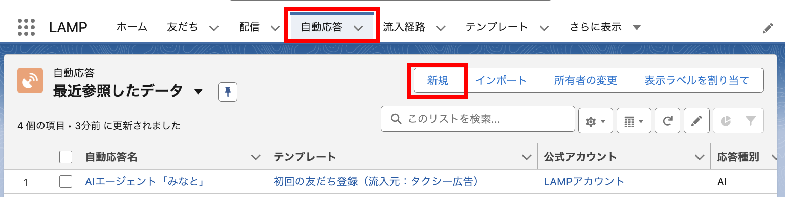 [自動応答]タブより[新規]ボタンをクリックして、新規の自動応答を作成します。