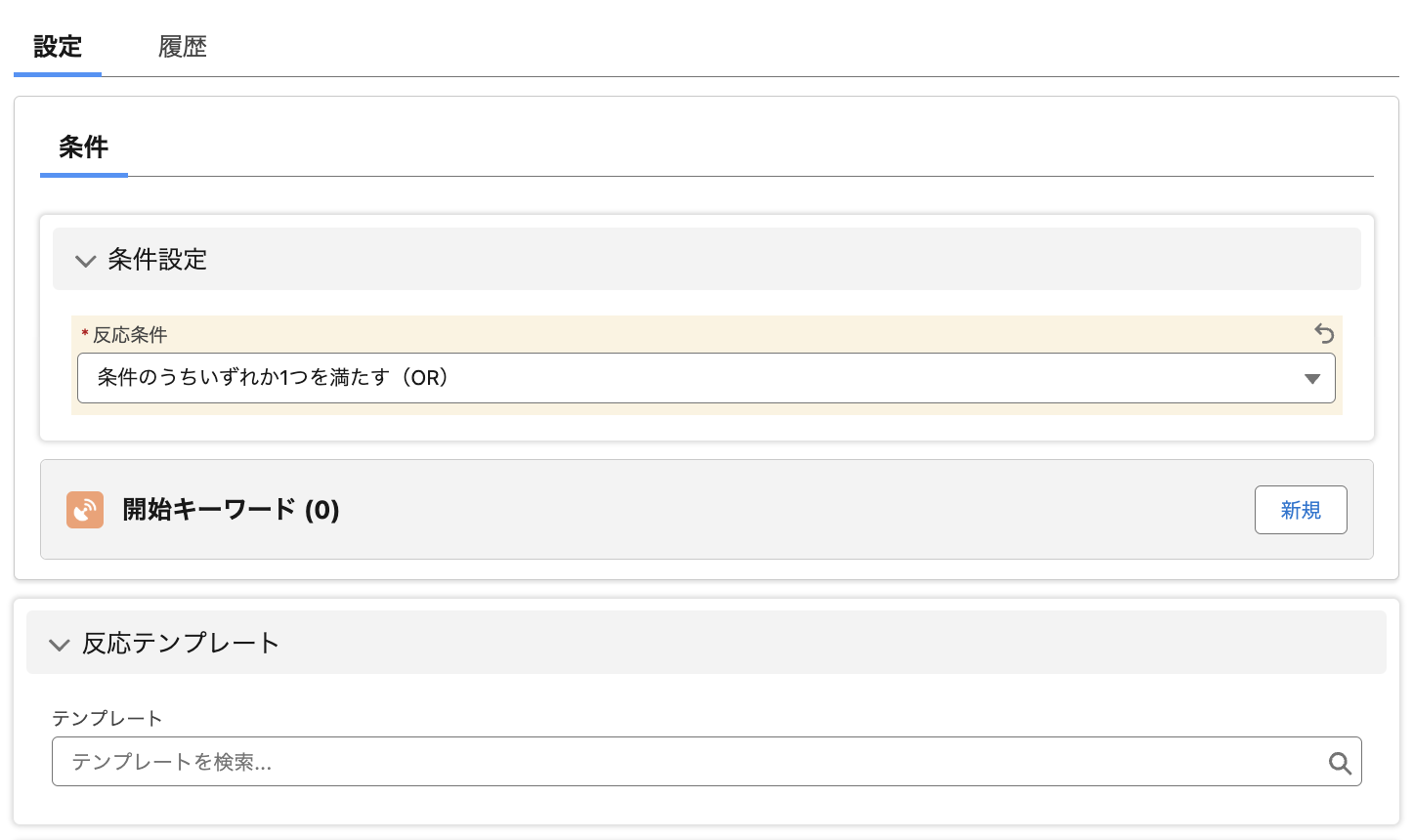 「反応テンプレート」にて、開始時テンプレートを設定できます。開始時条件が「常に反応」以外の場合は必須です。