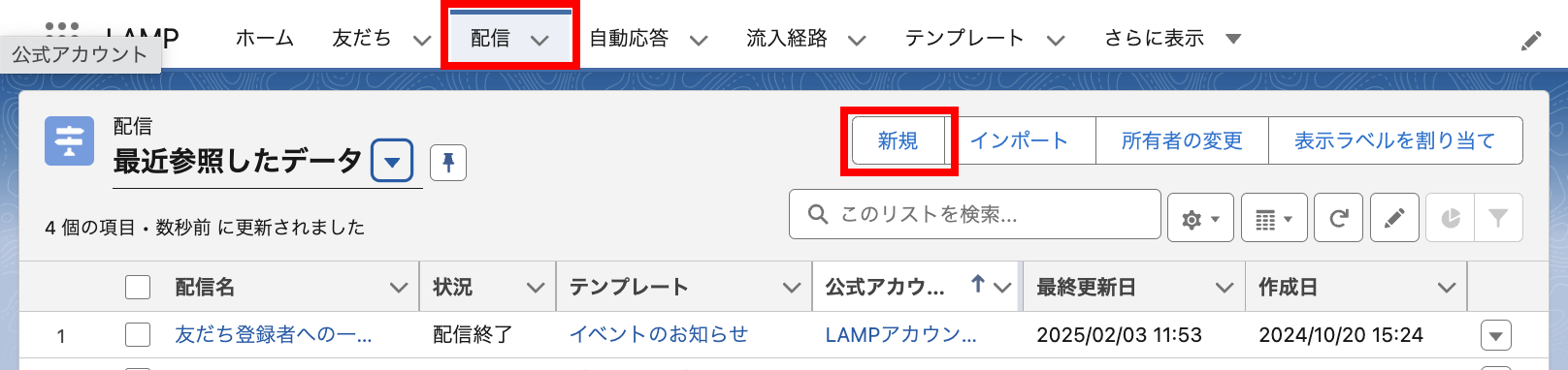 [配信]タブより[新規]をクリックして配信設定をおこないます。