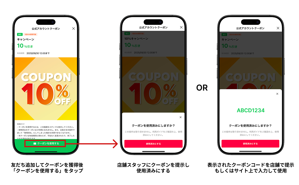 LAMPで発行したクーポンは、LINEに送信することで以下の流れで使用します。