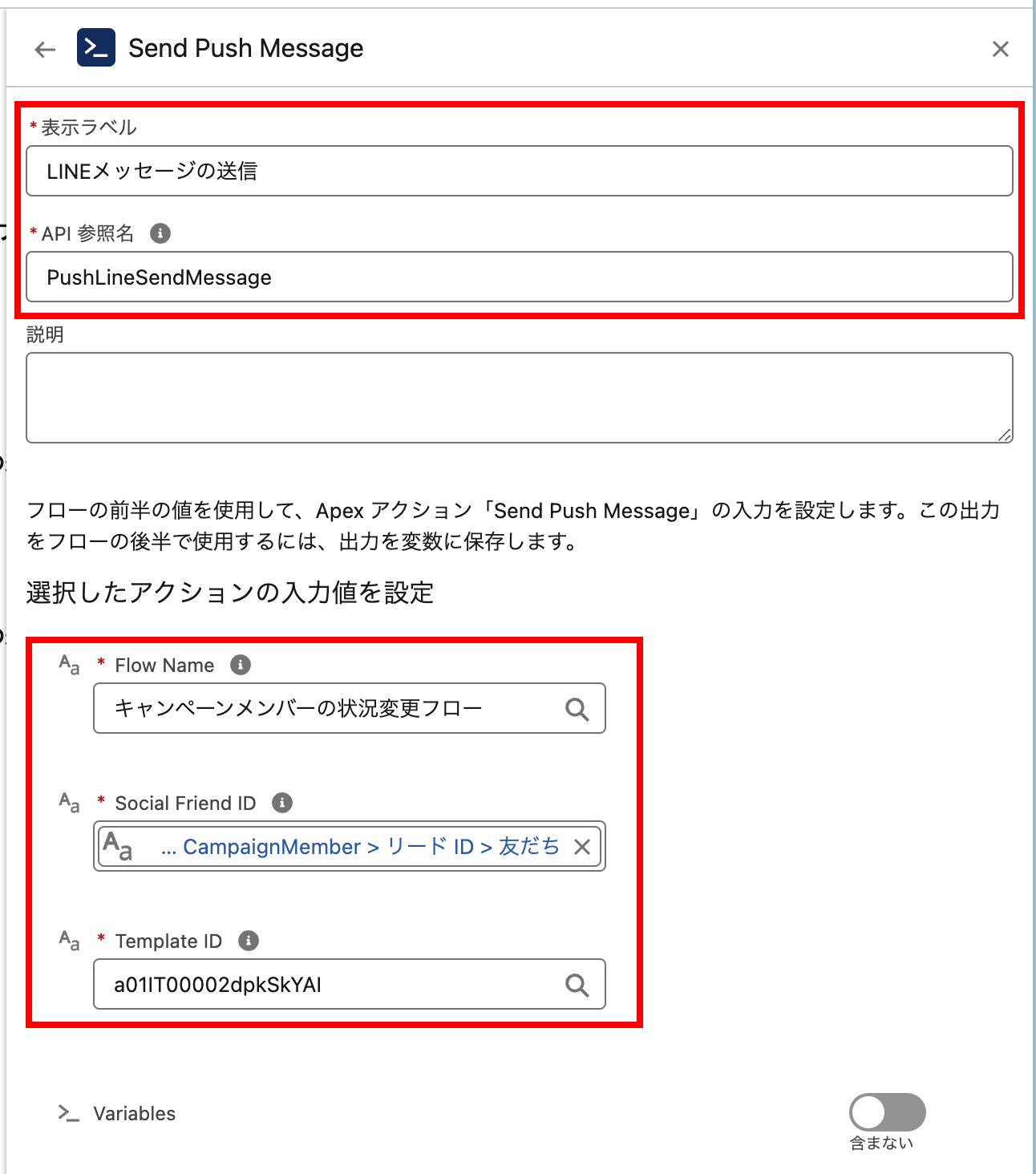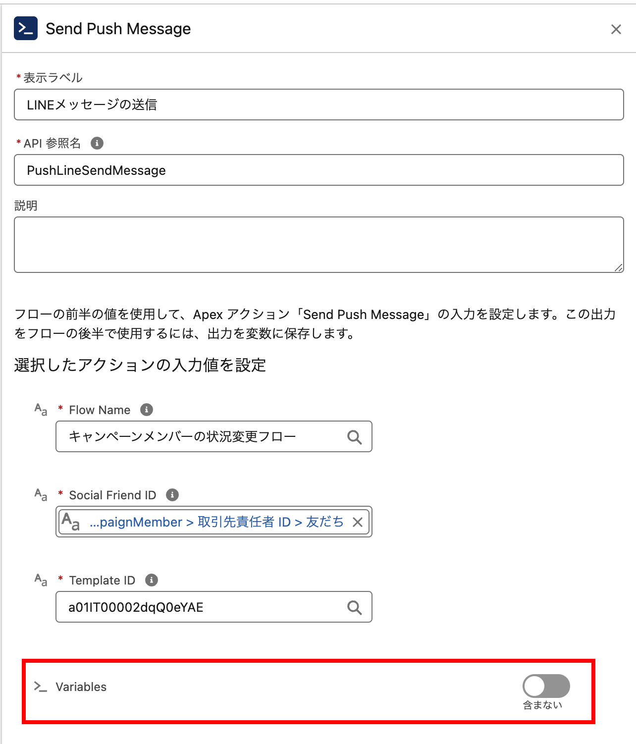 Send Push Messageアクションにて、VariablesのトグルをONにして「含む」に設定します。