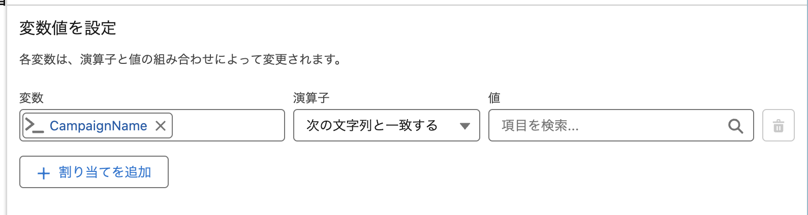 おなじように、 CampaignName > value の変数も用意し、ここにはキャンペーンの名前を選択して選びます。