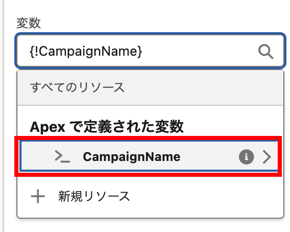 Apexで定義された変数 セクションにて[CampaignName]をクリックします。
