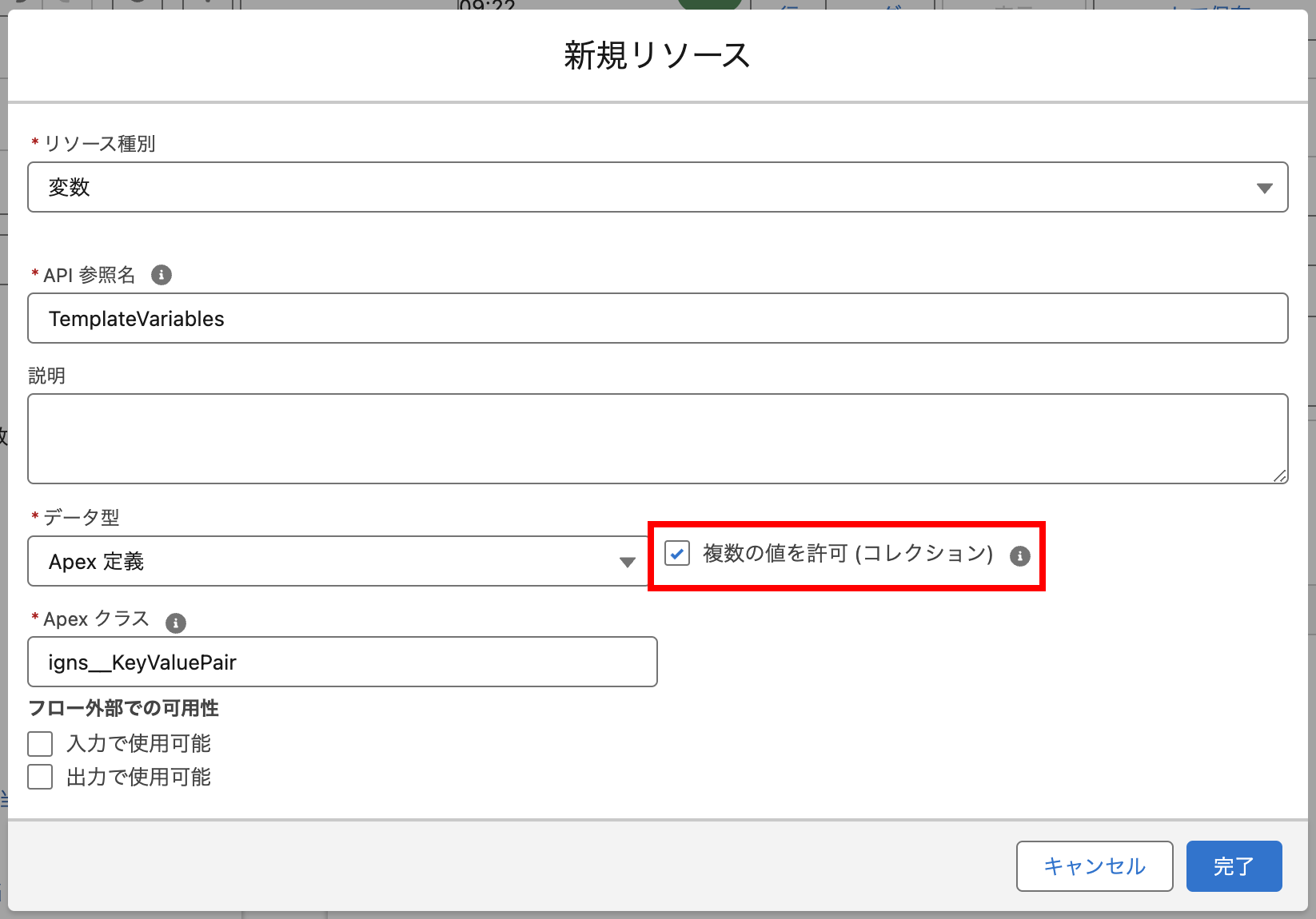 新しく変数を作成します。今回は、[複数の値を許可(コレクション)]に必ずチェックを入れます。