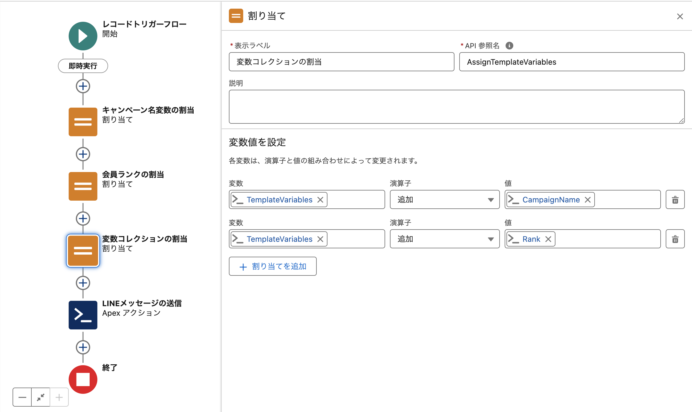 LINEメッセージの送信 Apexアクションの前で、変数コレクションへの変数割当を行います。