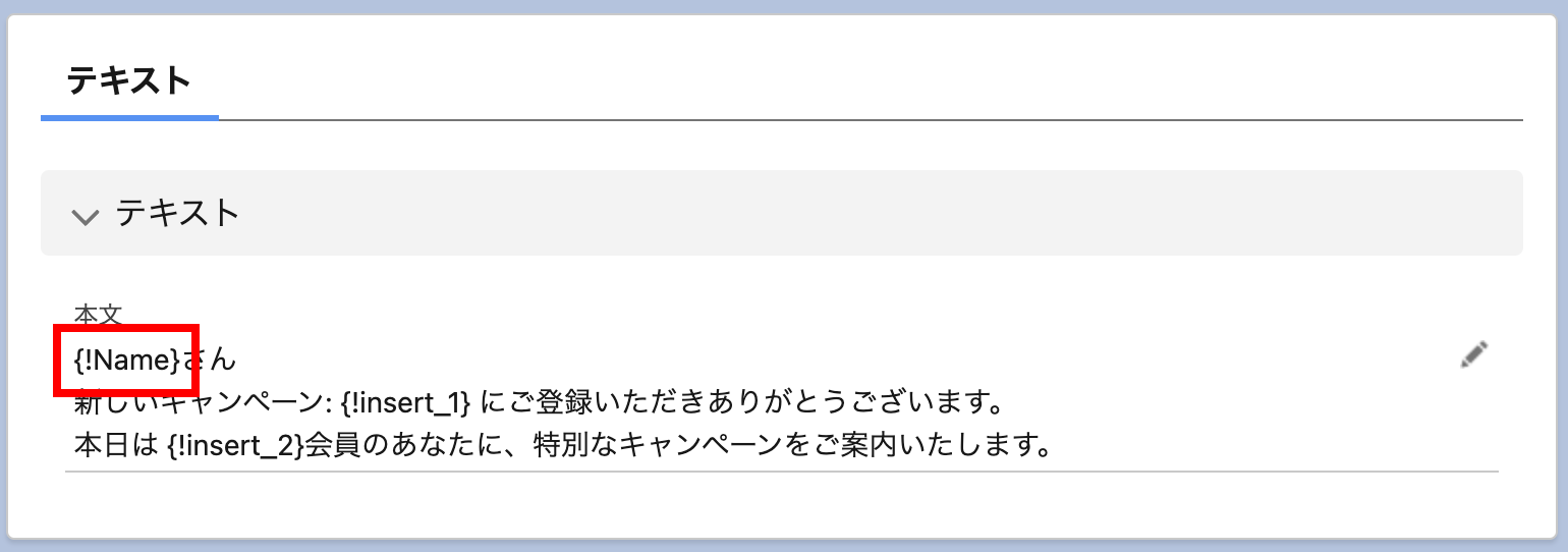 今回は、{!insert_1} にはキャンペーン名を、{!insert_2}には、[ゴールド]という文字列をそれぞれ変数として代入することを例に設定をします。