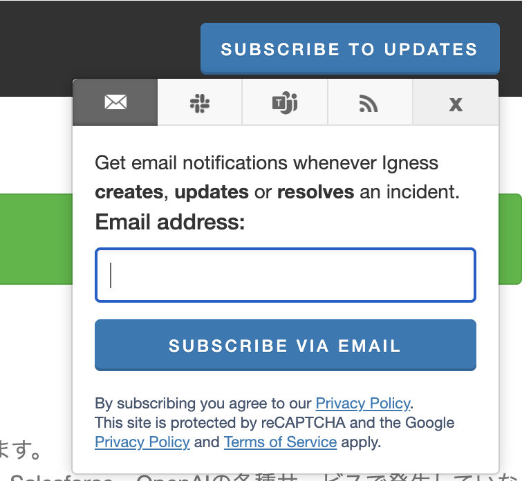 通知を受け取るには、画面右上の「SUBSCRIBE TO UPDATES」ボタンをクリックし、メールアドレスやSlack チャンネルなどお好みの形式で通知先を登録してください。