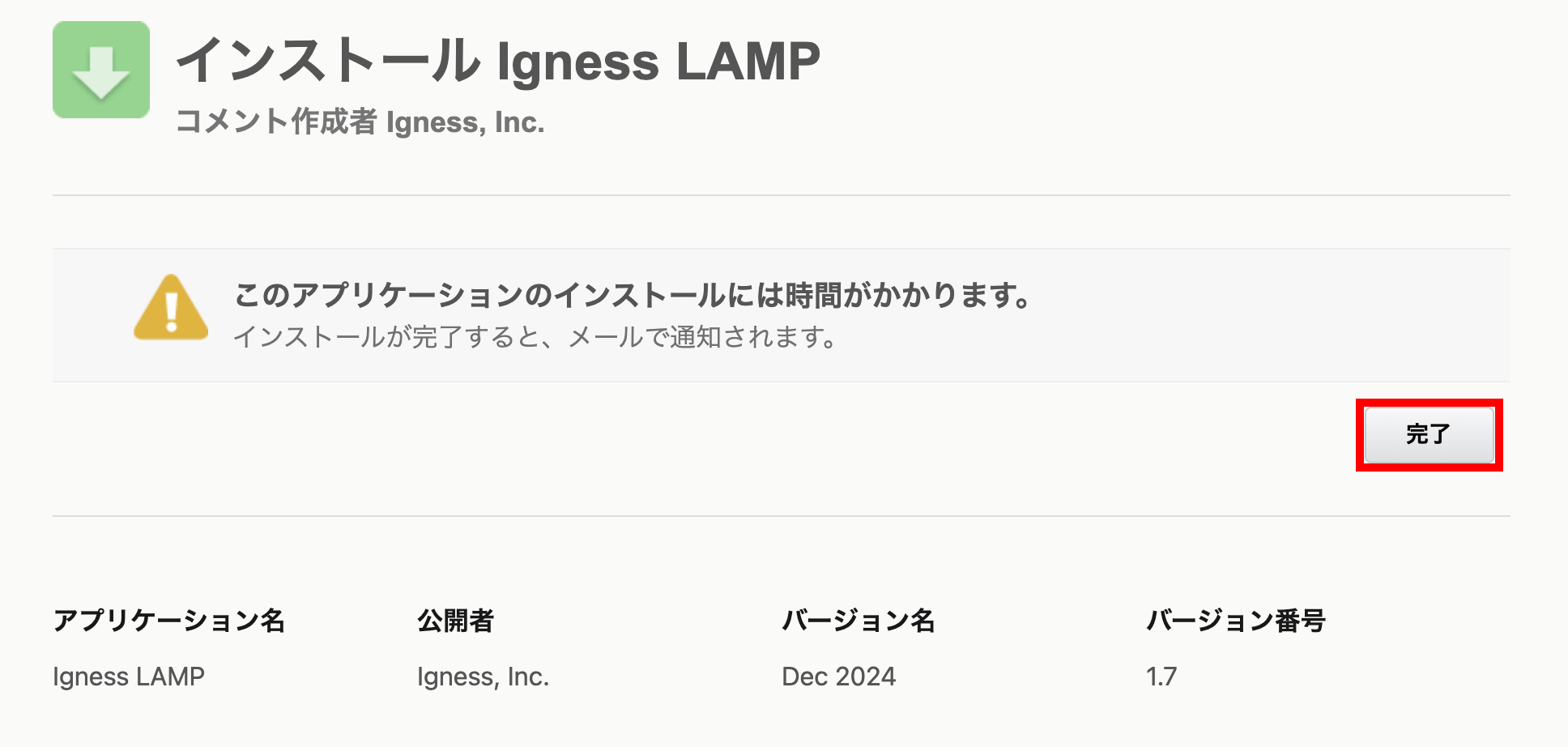 しばらくたって、ここに「Igness LAMP」がリストにあれば、インストールは完了です。