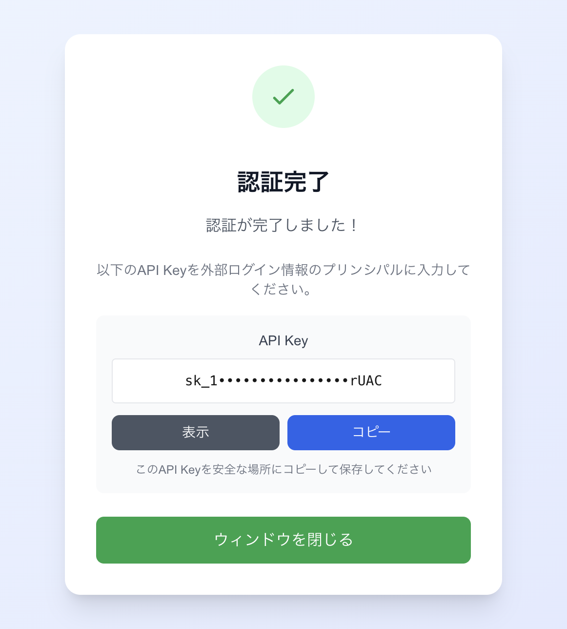 認証完了画面が表示されました!APIキーをコピーしてこのウィンドウを閉じます。