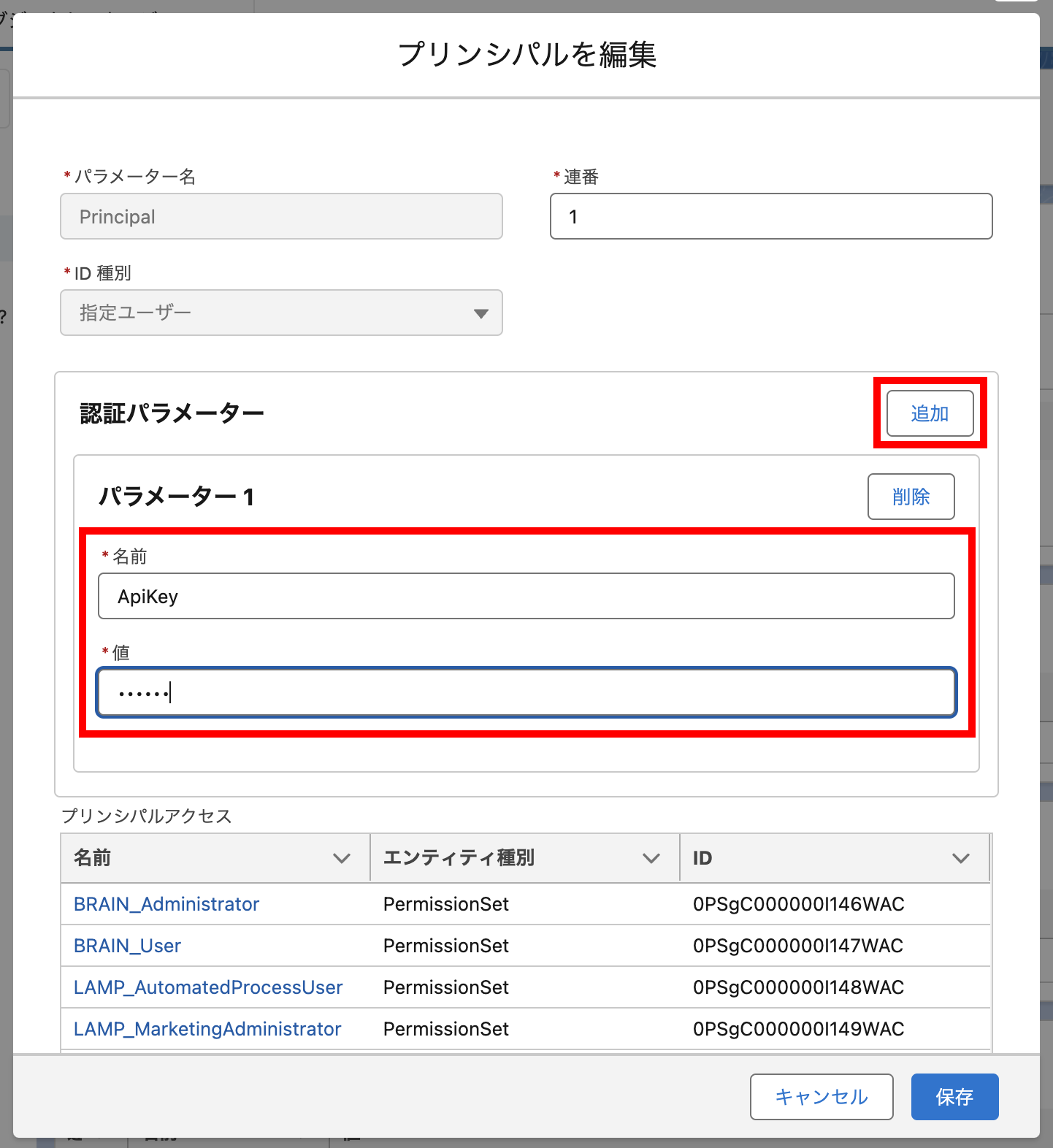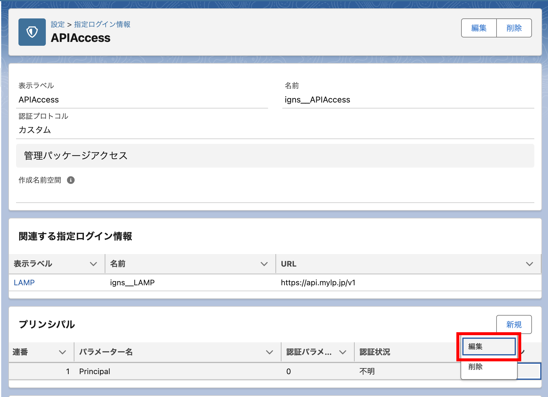 [プリンシパル]セクションに移動し、パラメーター名「Principal」のアクション[編集]をクリックして開きます。