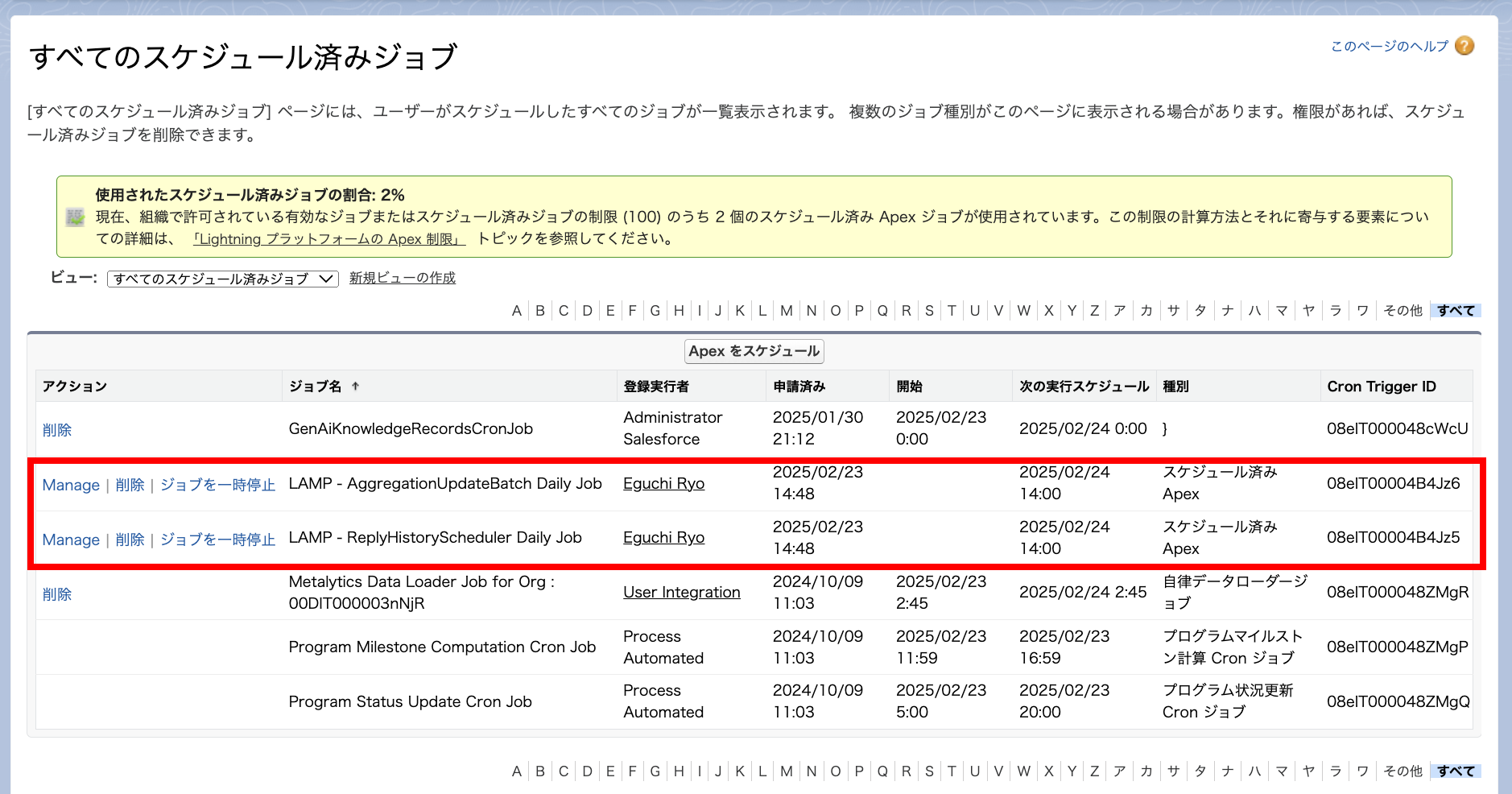 実行ボタンをクリックすると、2つのApexスケジューラーが起動します。