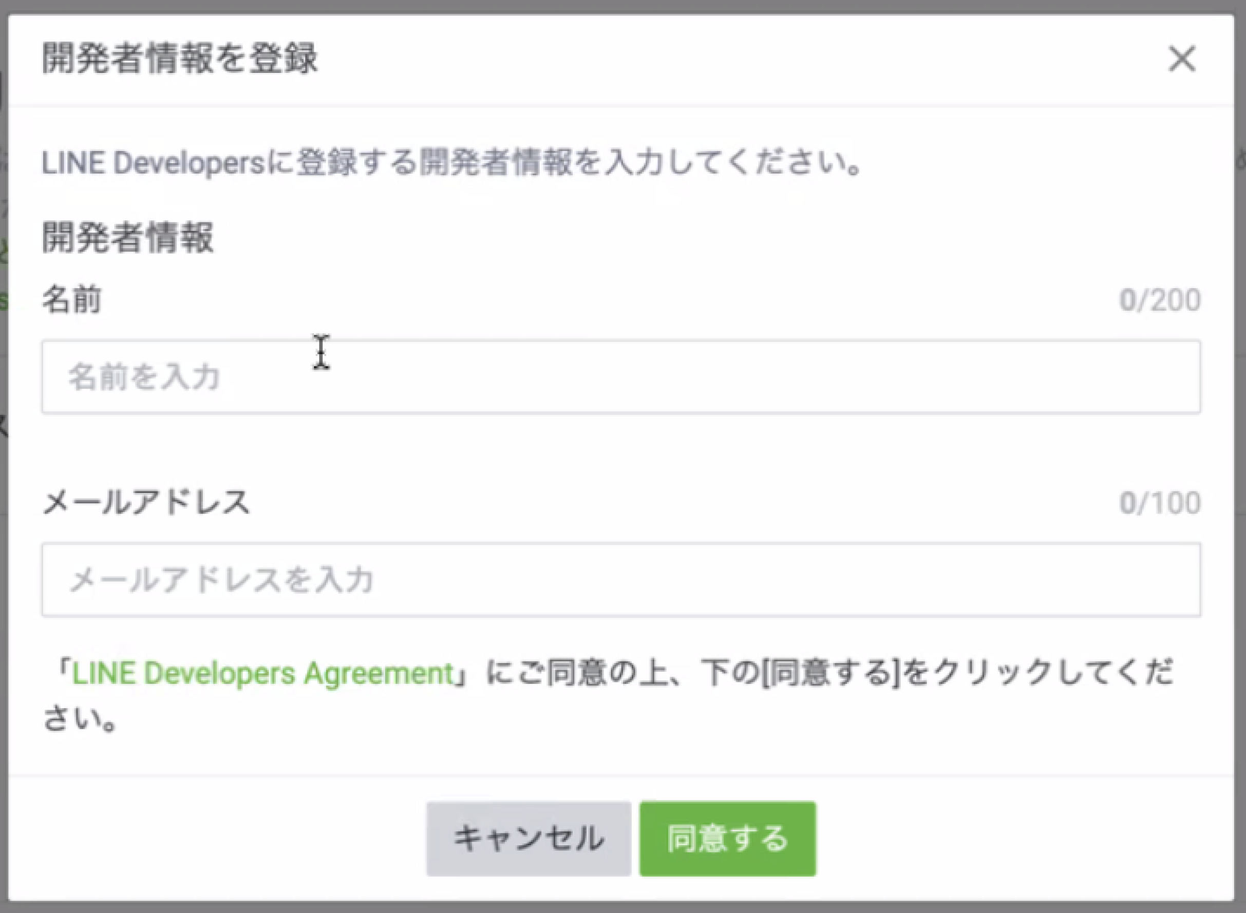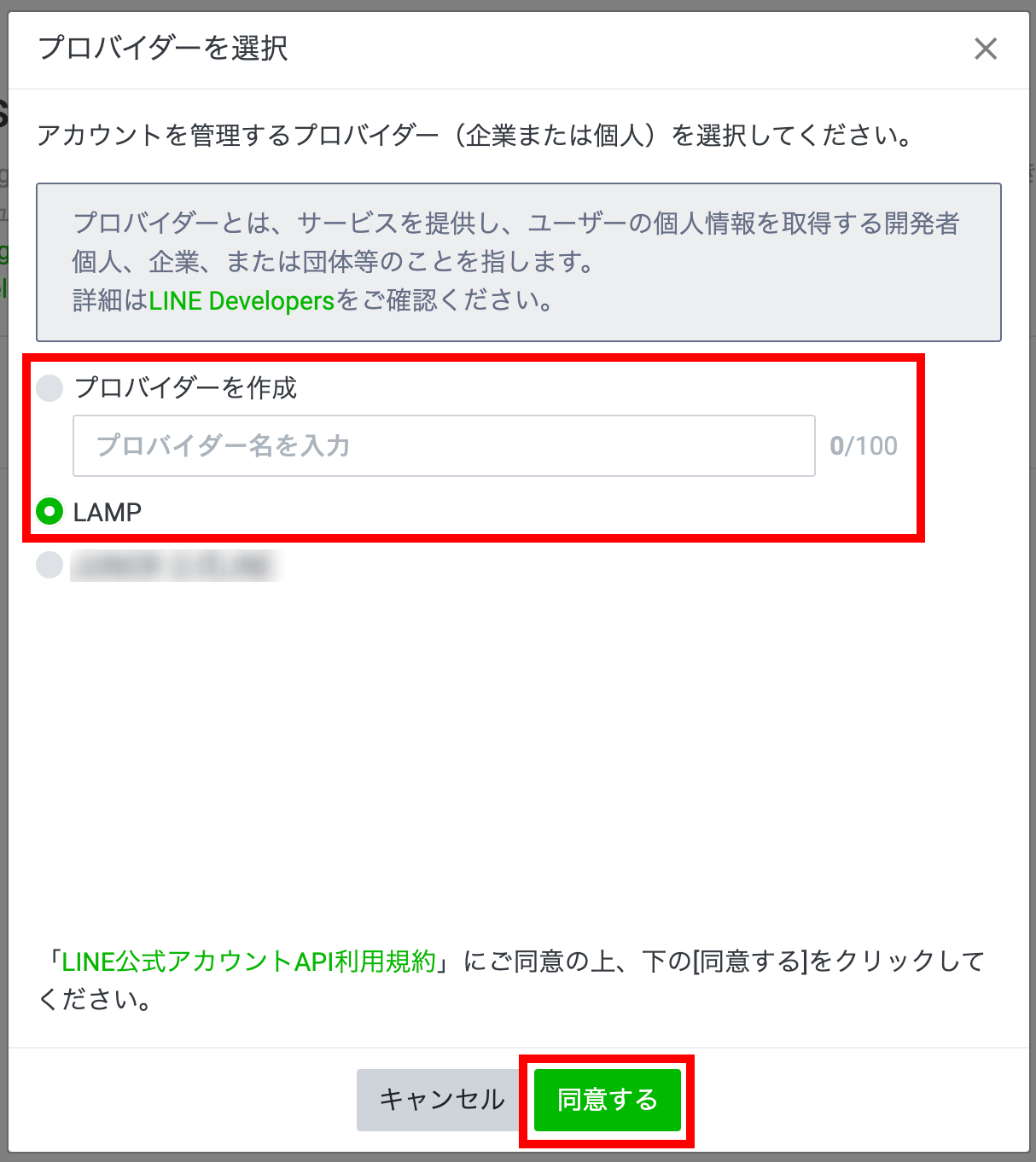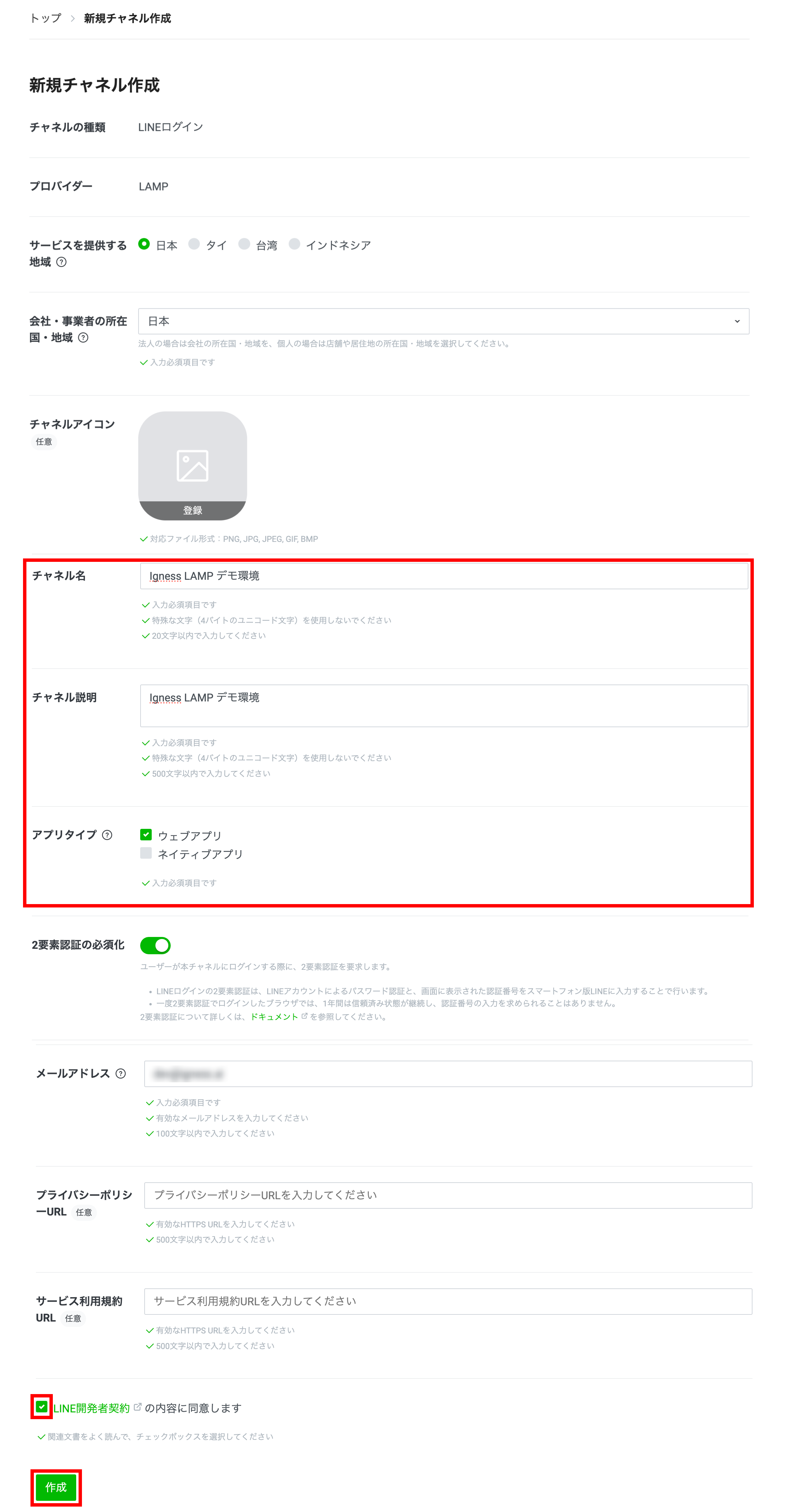 LINE開発者契約の内容を確認し、チェックを入れたら、「作成」をクリックします。