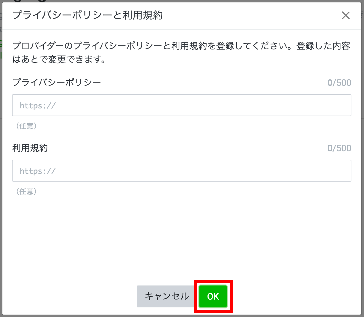 プライバシーポリシーと利用規約の設定画面が表示されます。本番環境で使用する場合は、必ず入力してください。テスト目的の場合は空欄でも次に進めます。