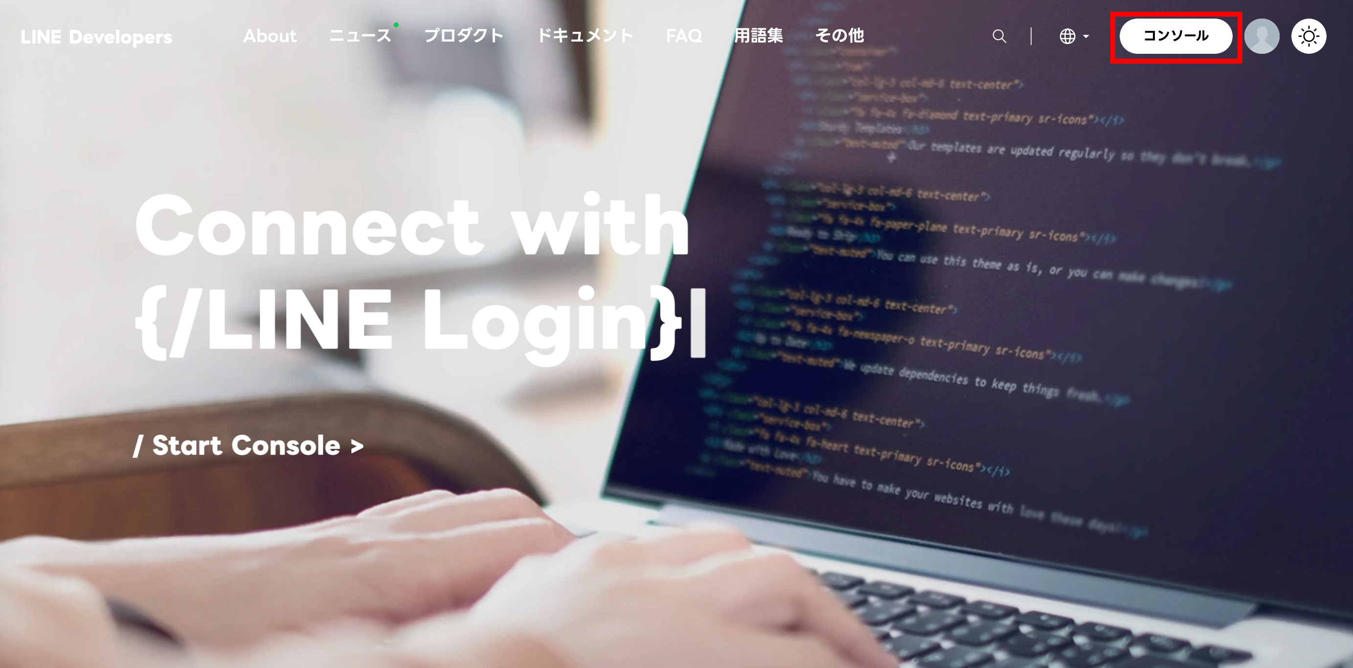 LINE Developers の公式ページより、「コンソール」をクリックしてコンソールを表示します。