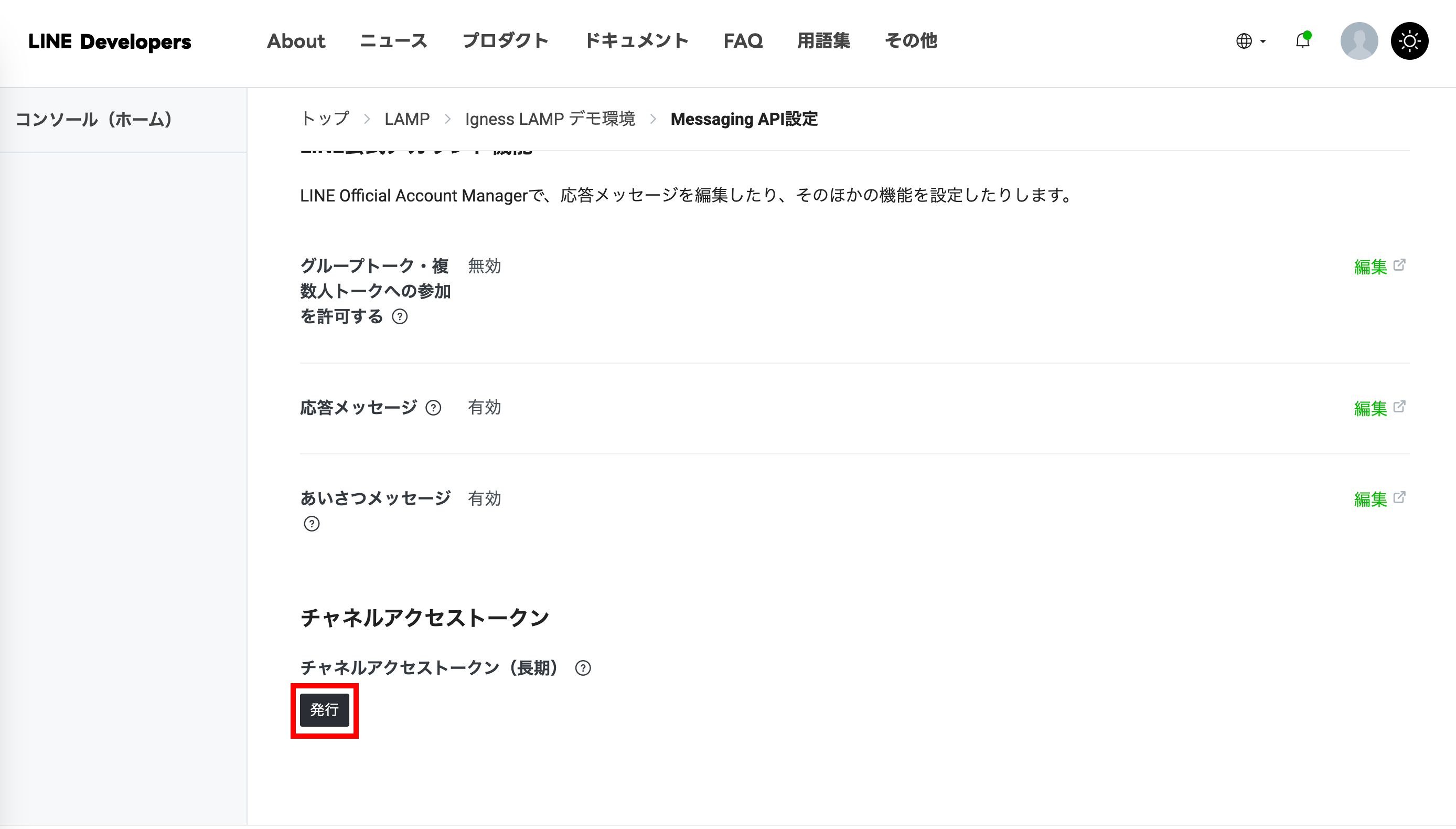LAMPサーバーとLINEとの連携の際に認証情報が必要になるため、「チャネルアクセストークン」を発行します。