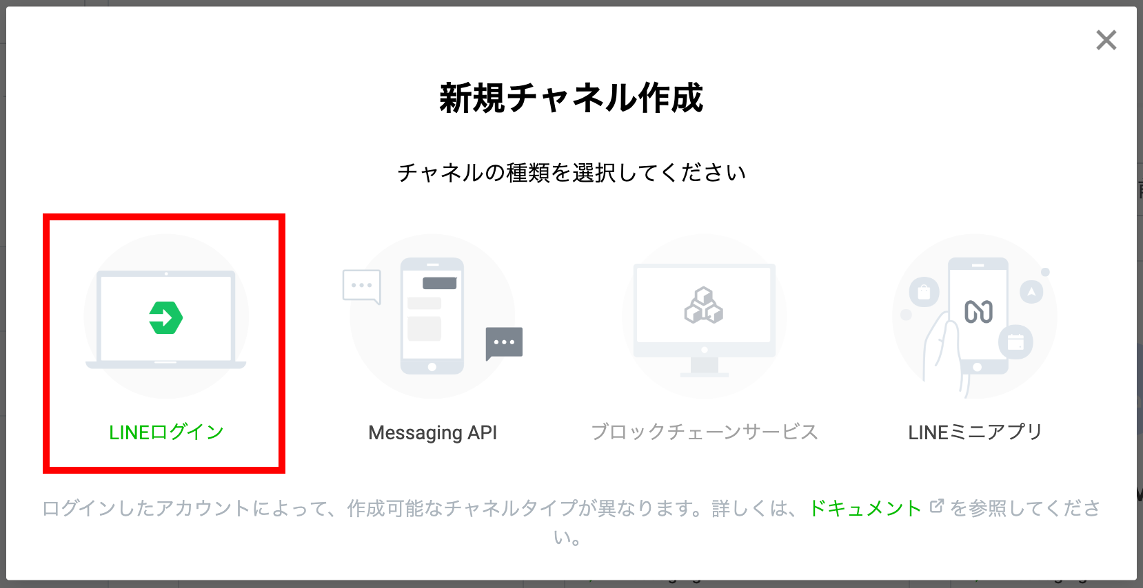 「新規チャネル作成」画面より、「LINEログイン」を選択します。