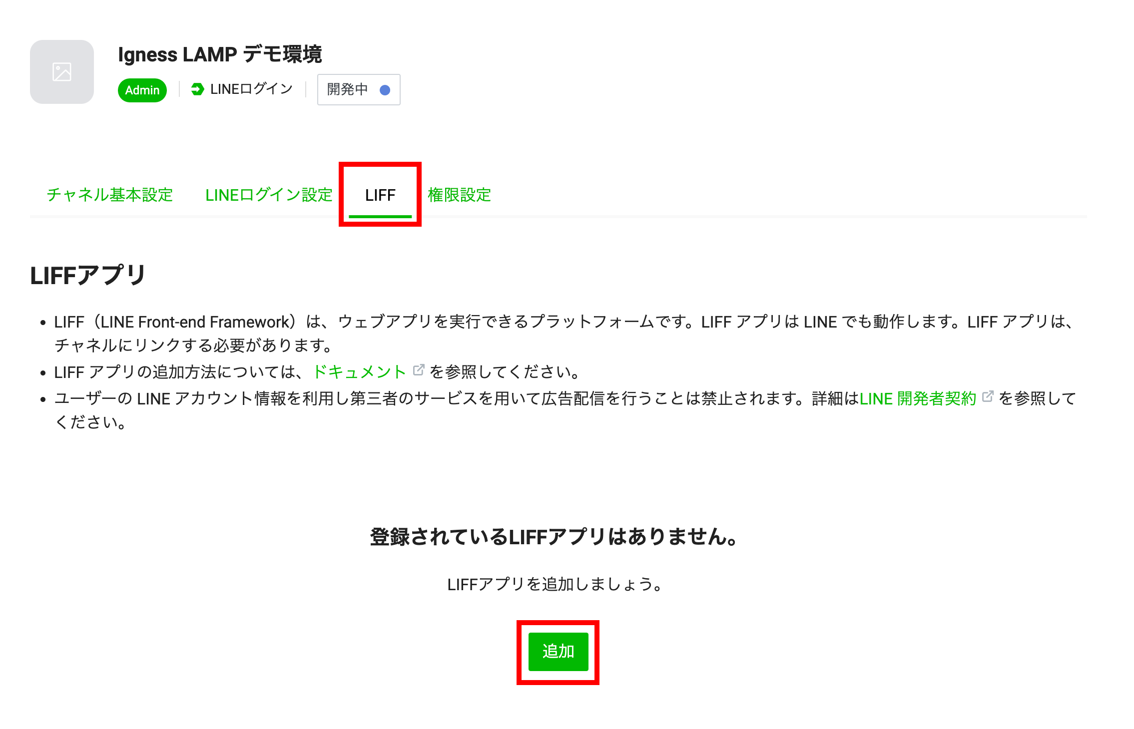 「LIFF」タブに移動し、「追加」をクリックします。