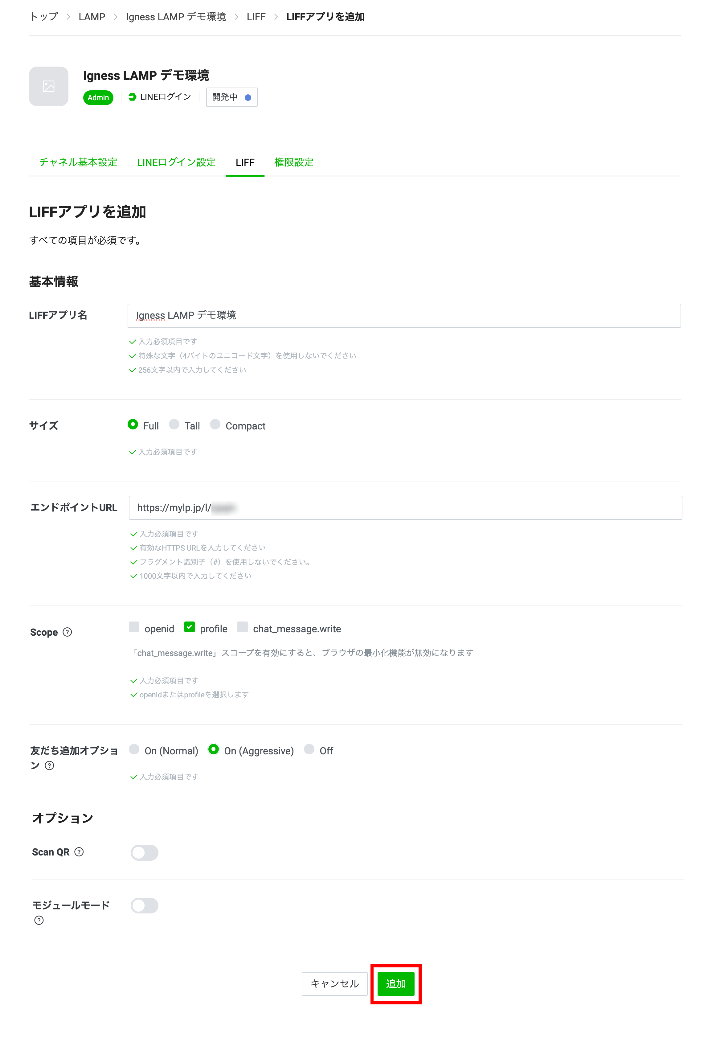 LIFFアプリを追加する画面にて、以下の表のように項目を記入し「追加」ボタンをクリックします。