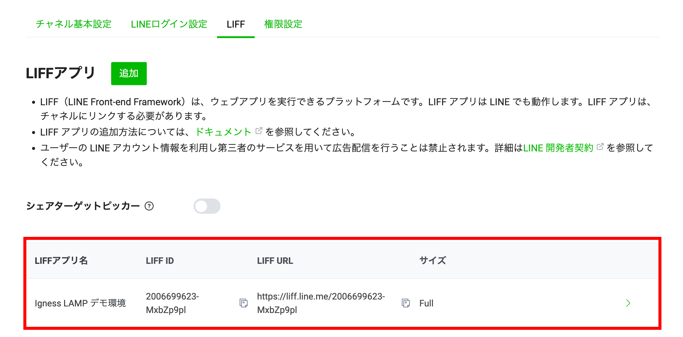 LIFF タブに移動し、LIFF IDが発行されたことを確認します。