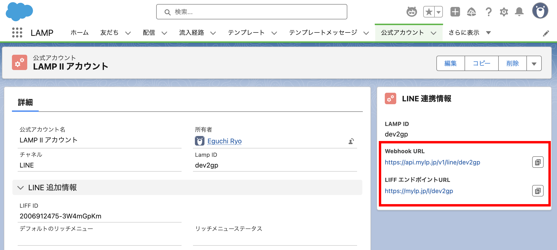 無事にLAMPで公式アカウントの設定が完了すると、Salesforceの公式アカウントページに以下のようにWebhook URLとLIFFエンドポイントURLが表示されます。これらの値を利用します。