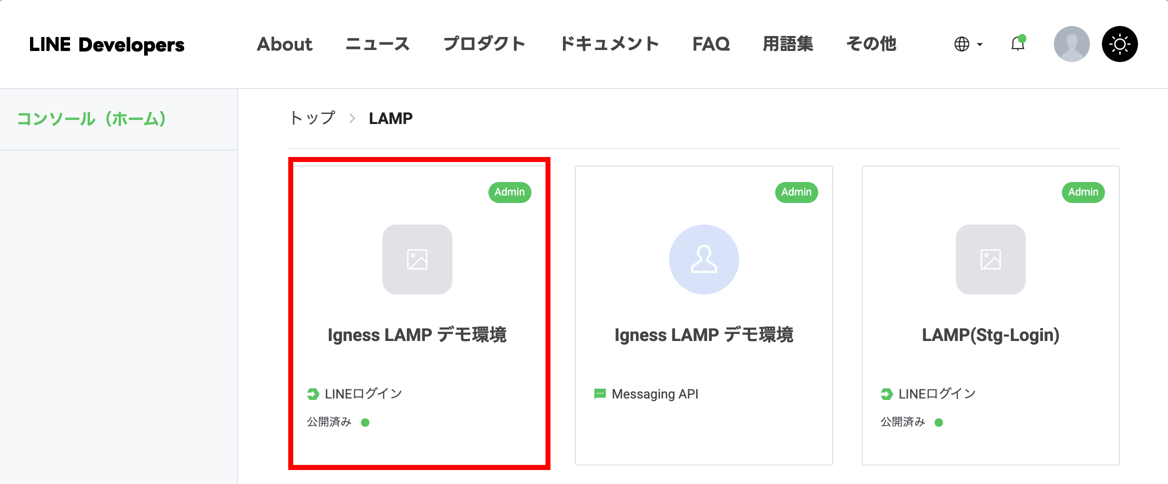 LINE Developers の公式ページより、「コンソール」をクリックしてコンソールを表示します。