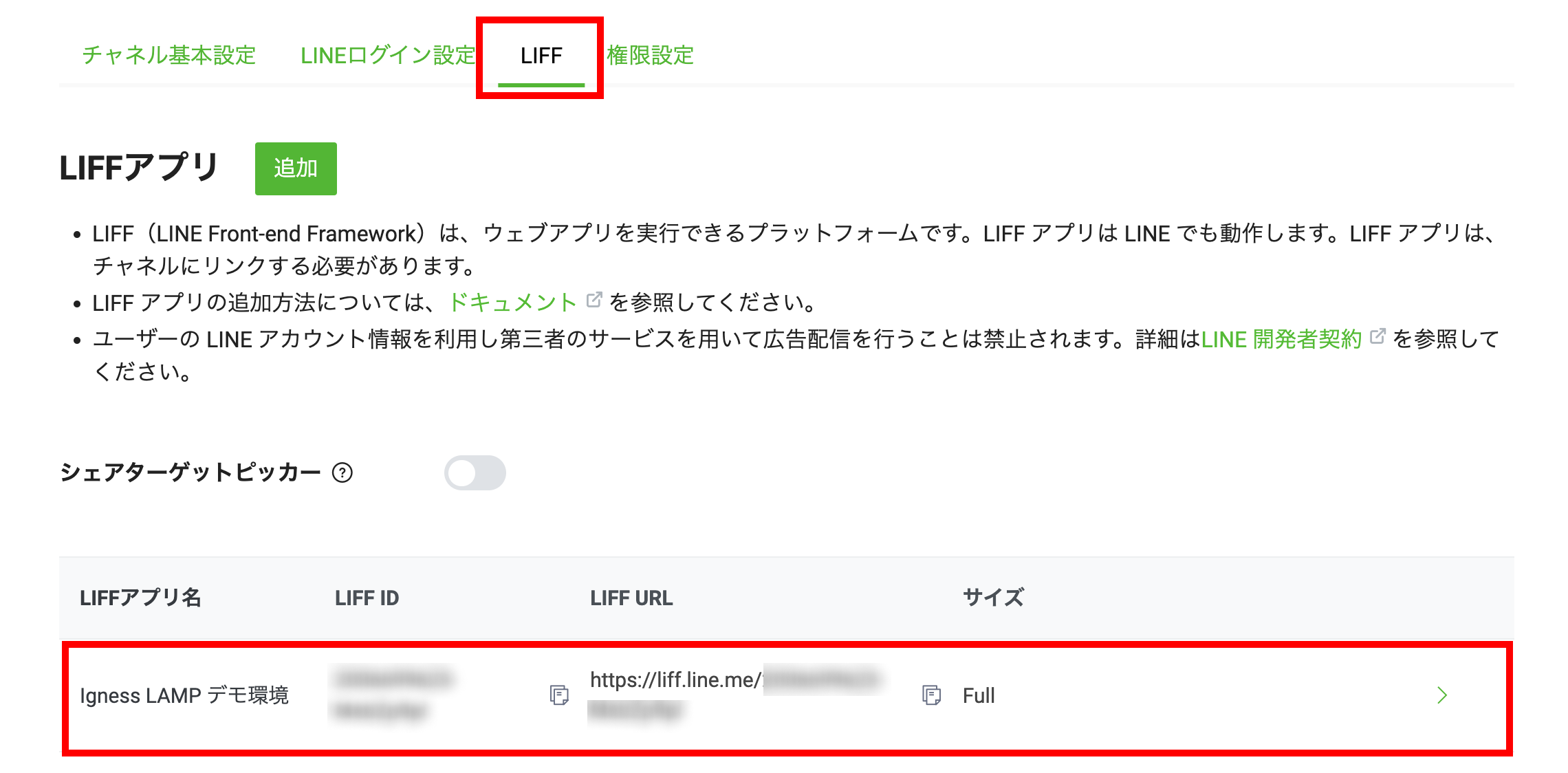 「LIFF」タブに移動し、Step2-2で作成したLIFFアプリをクリックします。