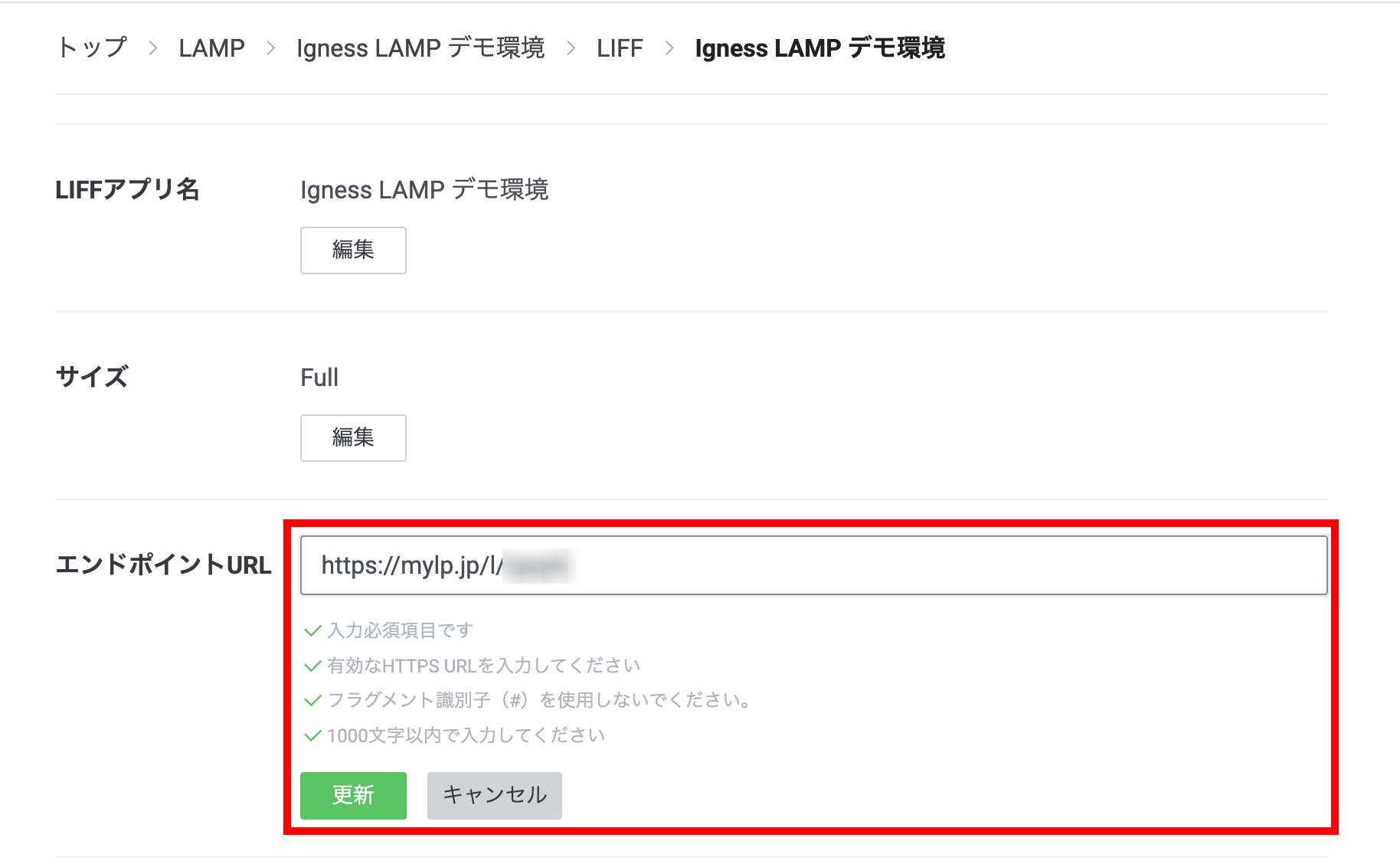 無事LAMP IDが発行できたら、LINE側に戻りそれぞれのURLを設定します。