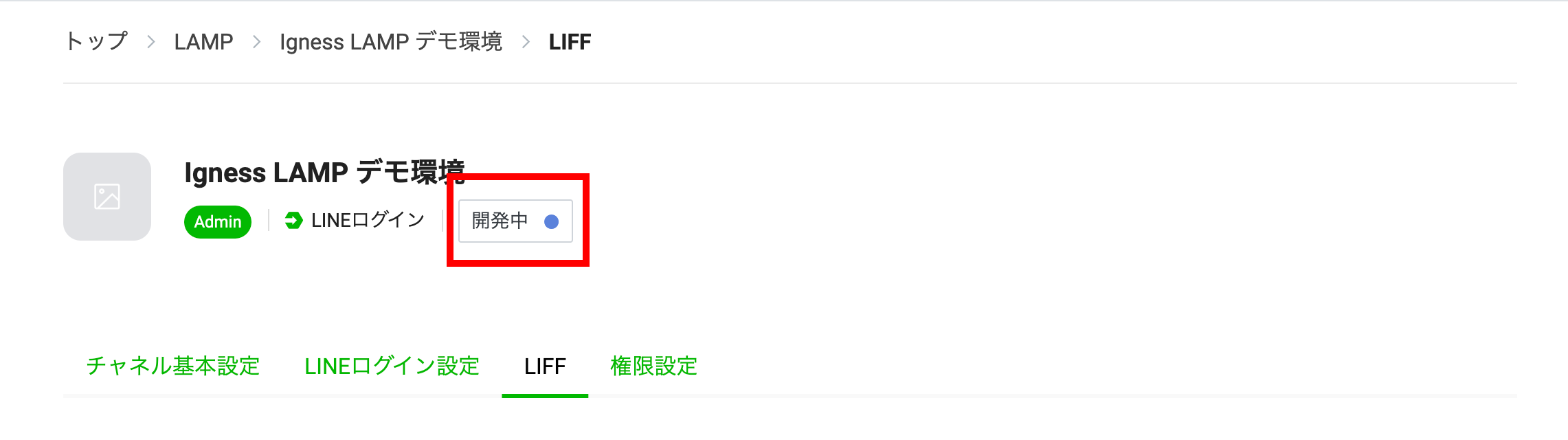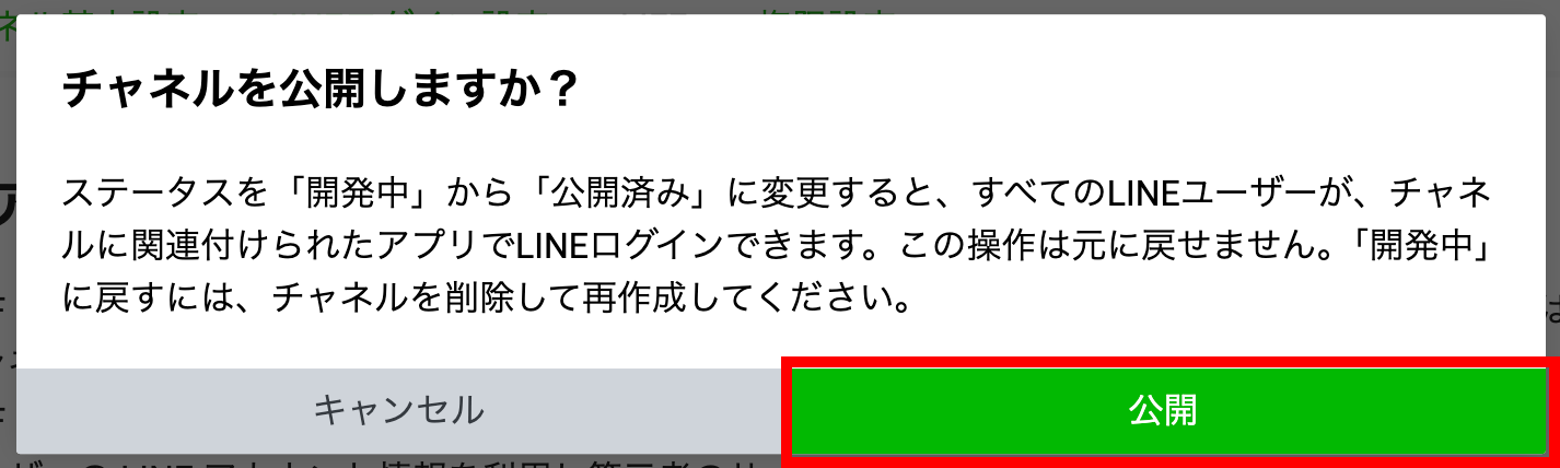 画面上部の「開発中」をクリックして、LIFFアプリを公開します。
