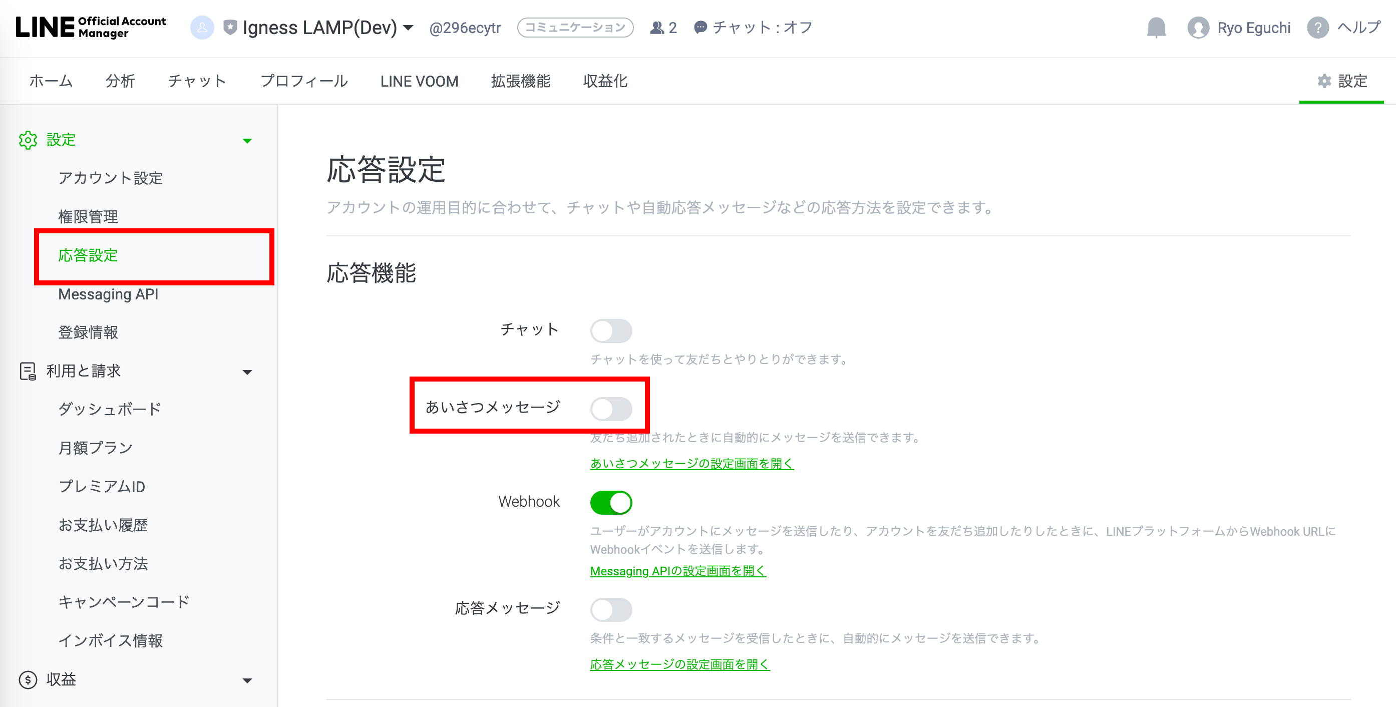 [応答設定]より[応答機能]セクションを開き、「あいさつメッセージ」をOFFにします。