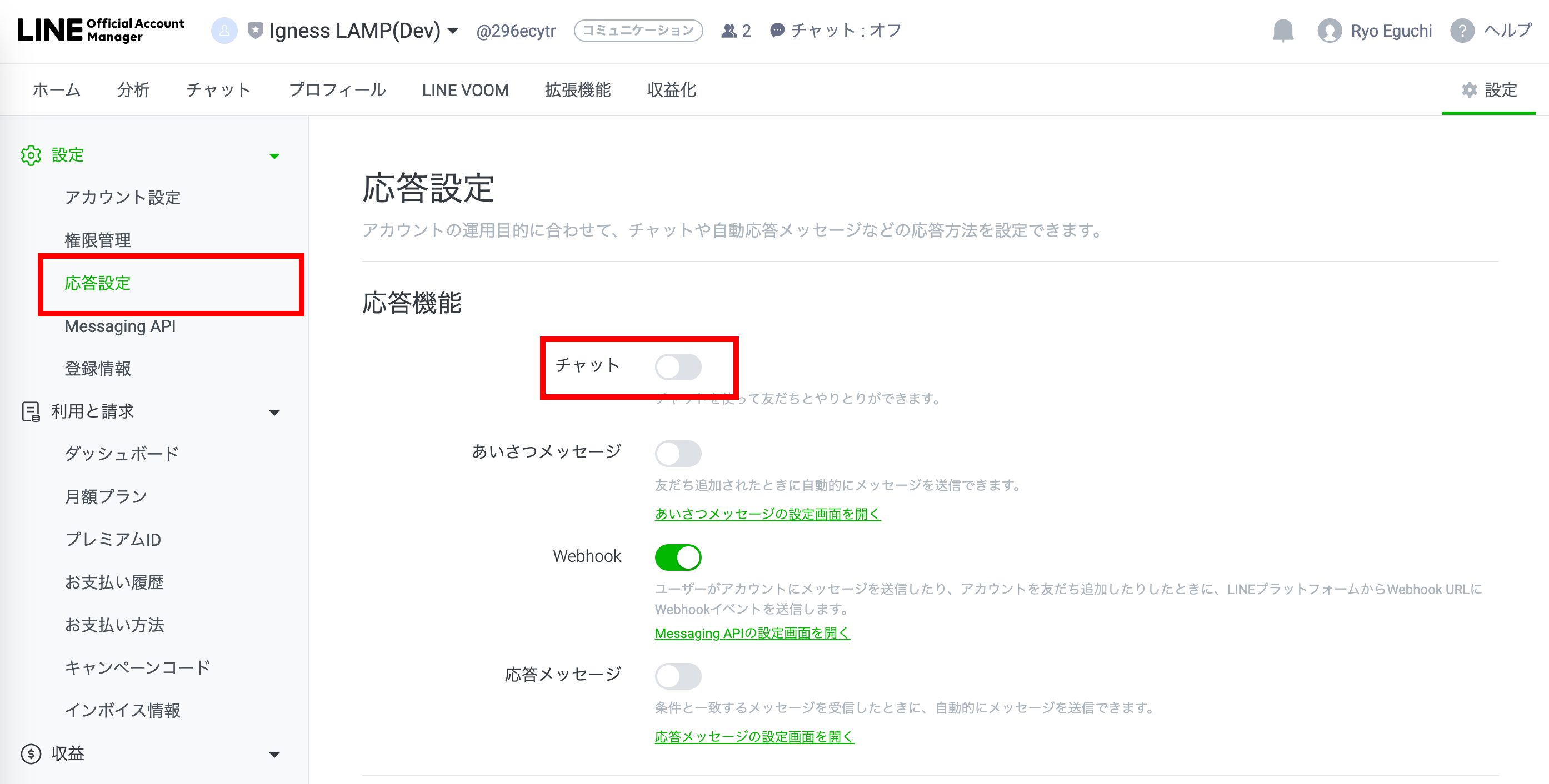 [応答設定]より[応答機能]セクションを開き、「チャット」をOFFにします。
