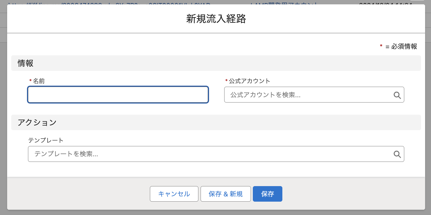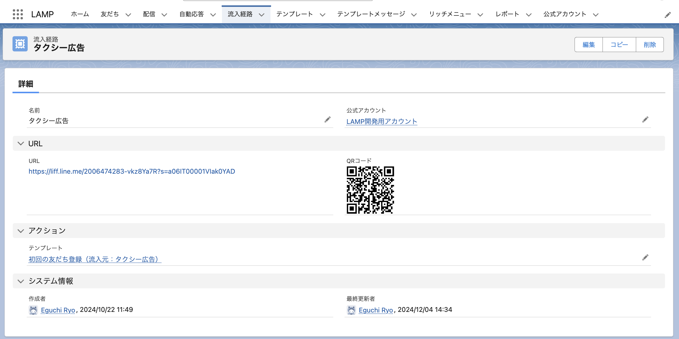流入経路の名前「疎通確認」を入力し、それに紐づく公式アカウントを選択します。