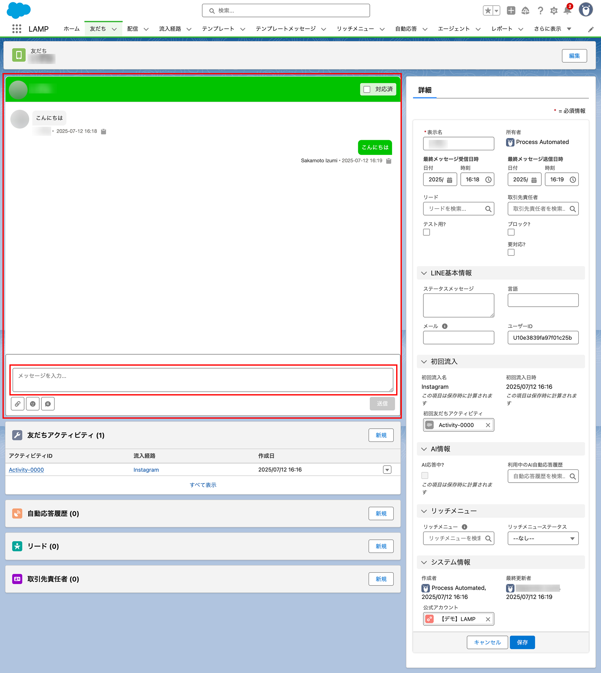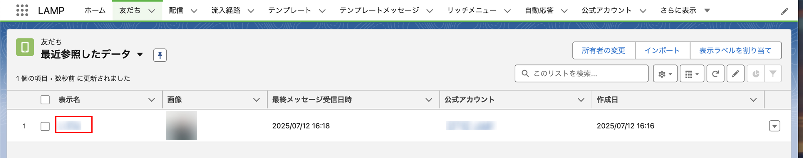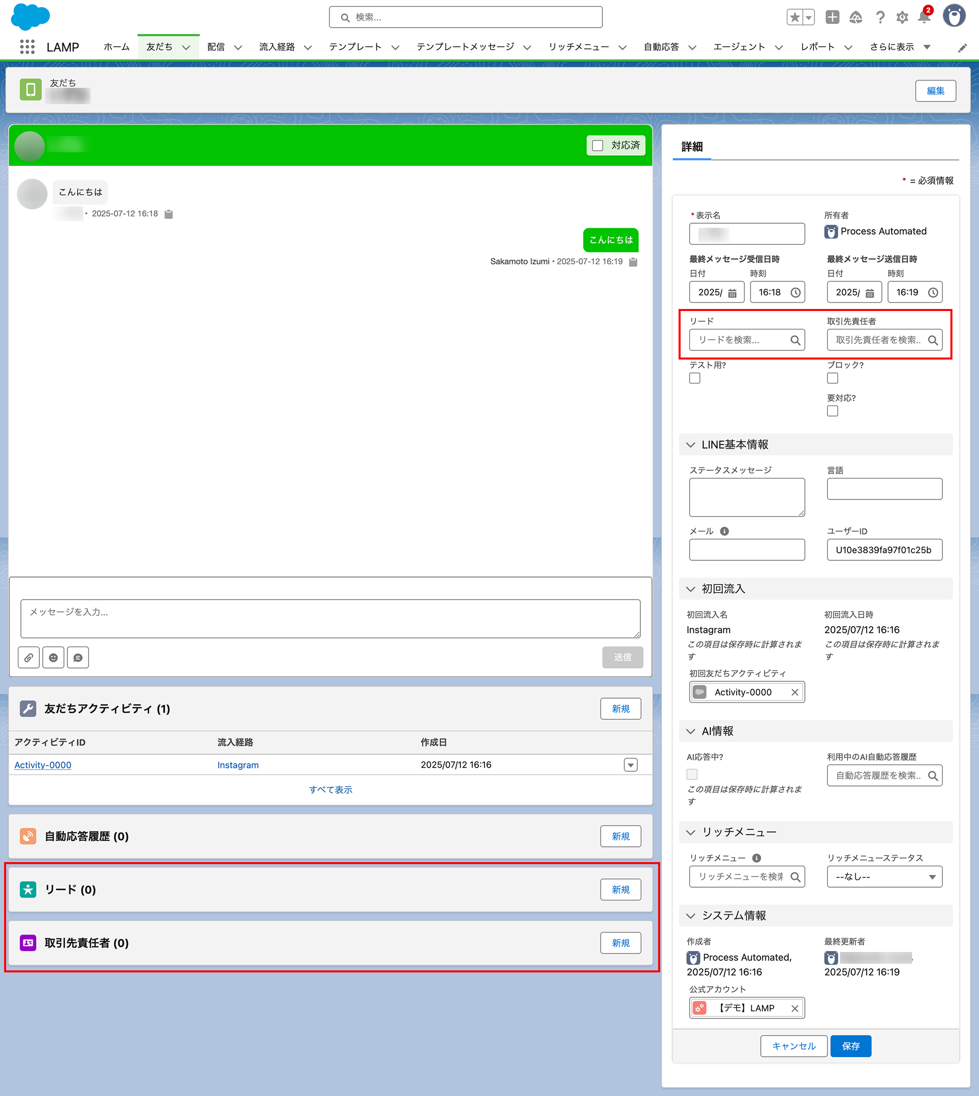 2-6で連携したリード・取引先責任者のレコードと、友だちが関連づけられているか確認します。