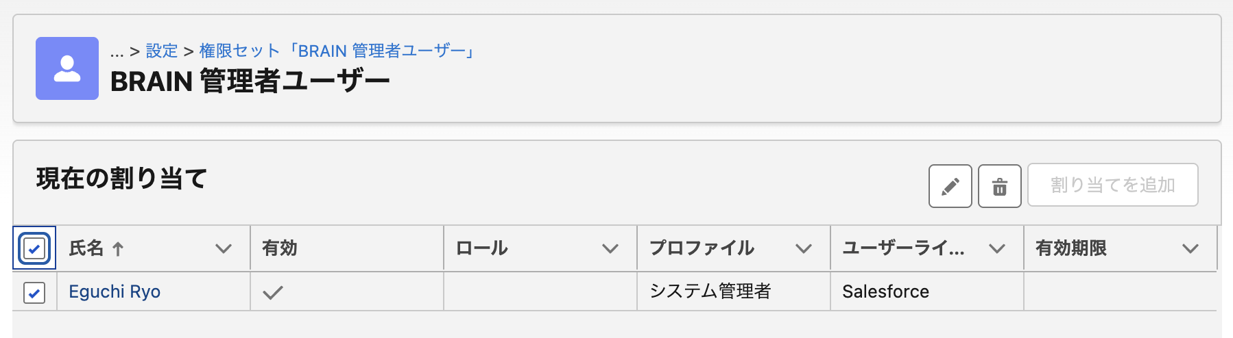 「権限セット」を開きます。LAMPやBRAINに関する権限セットを開き、権限セットの割当をすべて削除します。