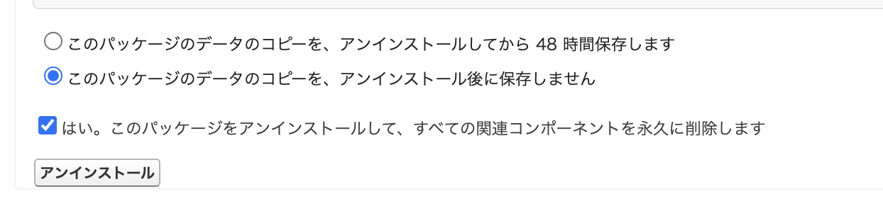 「はい。このパッケージをアンインストールして、すべての関連コンポーネントを永久に削除します」にチェックを入れて、「アンインストール」ボタンをクリックします。