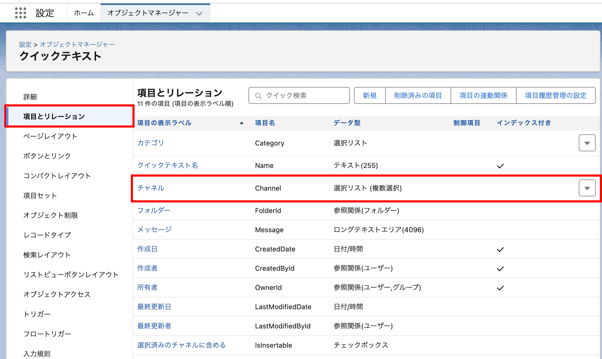 設定のオブジェクトマネージャにて、[クイックテキスト]の「項目とリレーション」の設定項目を開きます。