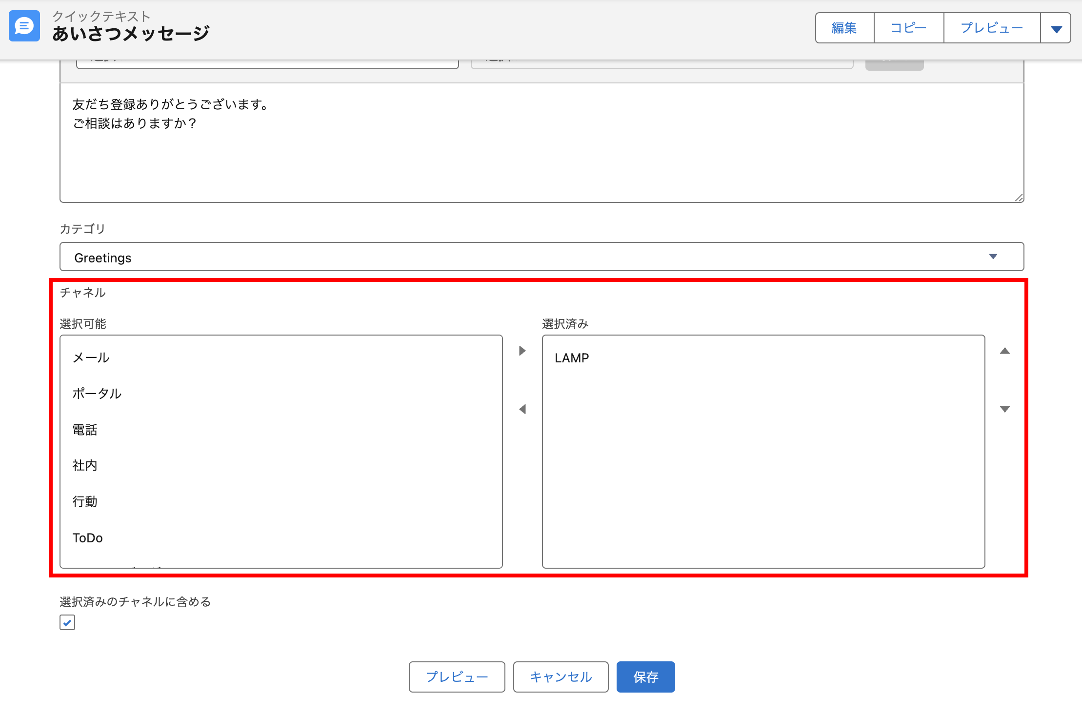 クイックテキストの数が多くなる場合、クイックテキストに「チャネル」を設定することでLAMPに表示するクイックテキストをフィルタして表示することができます。