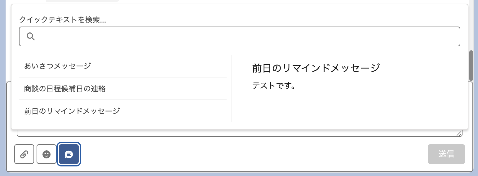 メッセージ画面より「クイックテキスト」アイコンをクリックすると、クイックテキストが開かれます。