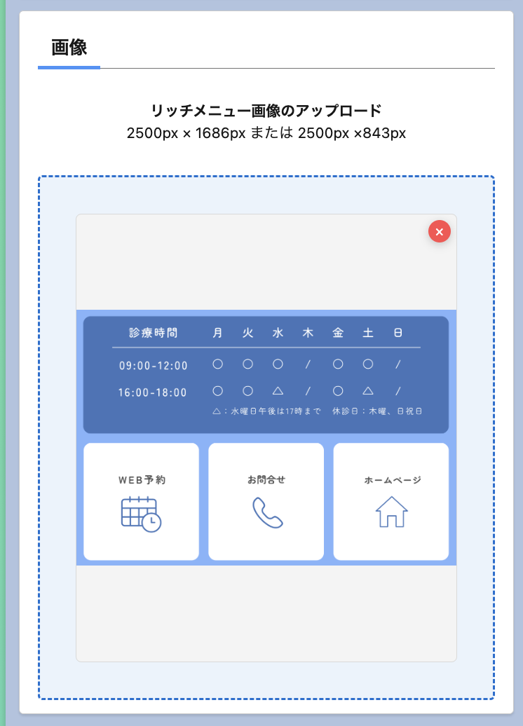 右下の「リッチメニュー画像のアップロード」画面にて、[ファイルを選択]ボタンをクリックして画像をアップロードしてください。