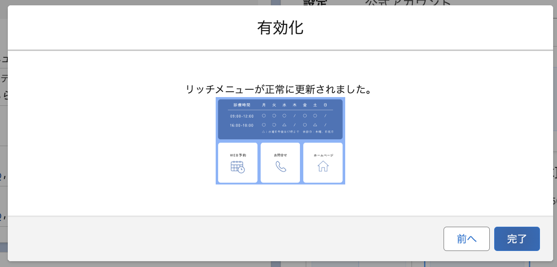 [完了]ボタンをクリックすると、リッチメニューが正常に作成されます。